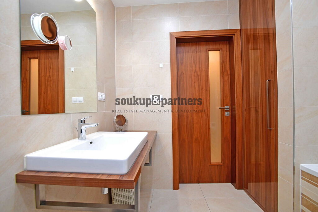 Obývací pokoj disponuje samostatným balkonem o výměře 5,3 m2 a kuchyňským koutem, který je vybaven spotřebiči - lednicí s mrazákem, indukční deskou, horkovzdušnou troubou, myčkou, mikrovlnnou troubou a digestoří. Ložnice je vybavena vestavěnou skříní a je zde přímý vstup do lodžie (8,4 m2). V koupelně je zvolena vana s pevnostním sklem, dále je zde WC, umyvadlo se skříňkou a zrcadlo, vstupní chodba má další úložné prostory a technická místnost připojení na pračku a sušičku, dále byt obsahuje interiérové dveře včetně obložení Sapelli, vstupní bezpečnostní dveře zn. NEXT, na podlahách dlažba a krytina Barkotex (laminát). Byt je také vybaven klimatizací.