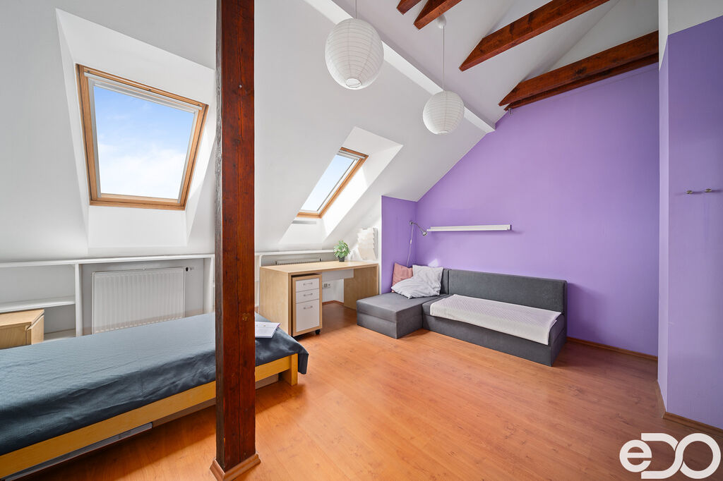 Dispozice v podkroví: pokoj s výstupem na balkon, ložnice, dětský pokoj, koupelna se sprchovým koutem a WC.