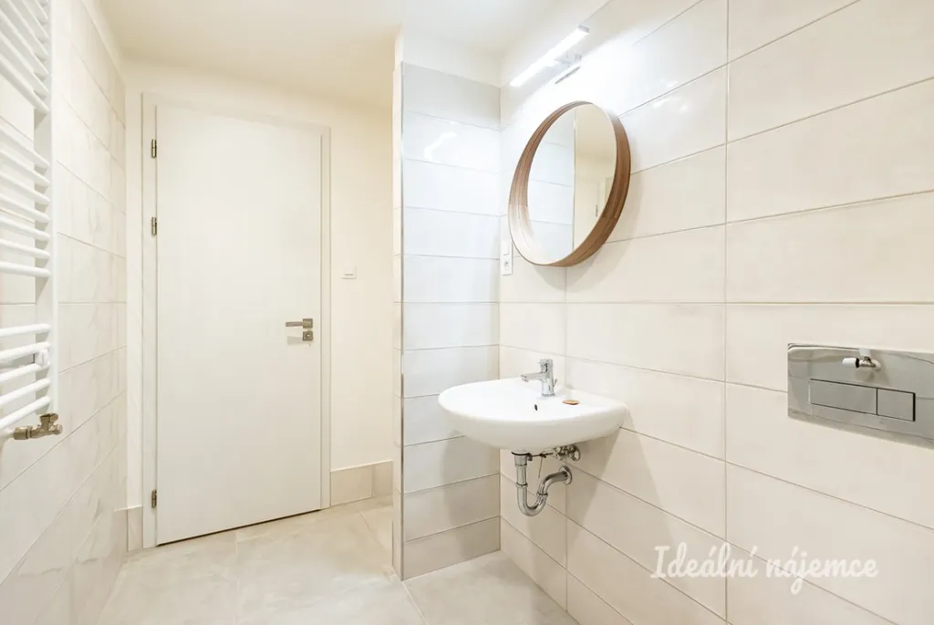 Koupelna je vybavena sprchovým koutem, umyvadlem, toaletou a připraveným prostorem pro pračku.
