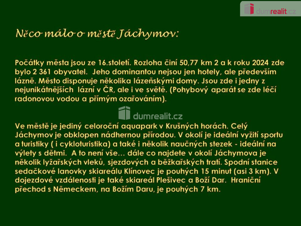 Dumrealit.cz Vám zprostředkuje exkluzivně prodej bytové jednotky 2+1, o celkové ploše bytu 60,45 m², umístěné ve 2.patře zatepleného panelového domu, s plastovými okny, v příjemné a klidné části historického lázeňského města Jáchymov, okres K.Vary. Vzdálenost K.Vary - Jáchymov je 20km. Pouze 8km se nachází Boží Dar, jenž je oblíbeným střediskem pro letní a zimní dovolené. Milovníci lyžování, turistiky tohle jistě uvítají. Bytová jednotka disponující se dvěma samostatnými neprůchozími pokoji prošla rekonstrukcí, vkusnou proměnou v části předsíně, kde díky stavebním úpravám (doloženo st. dokumentací) došlo ke změně koupelnového jádra a předsíň tím tak získala řešení pro menší úložný prostor. Koupelna nabízí vanu a zároveň sprchový kout. Příjemným bonusem je vyhřívaná podlaha. WC odděleno. Na bytě postupně probíhající zmíněné rekonstrukce byly v průběhu 20let. Elektřina v celém bytě (zásuvky a vypínače) je v mědi. Pokrytí podlahy v kuchyni odolným vinylem (provedeno před 2lety). Dům je udržovaný, má nové odpady, stoupačky a před 2lety byl instalován nový výtah. Vytápění a ohřev vody zajišťuje vlastní společný plynový kotel, umístěn v sklepní části (každý byt má svůj měřič tepla). Nechybí vlastní sklepní kóje a společná sušárna, prádelna, kočárkárna. Společná je také lodžie v mezipatře (pouze pro tento byt, k bezplatnému využívání - domluveno se SVJ). Parkoviště před domem. Dobrá občanská vybavenost. Např. školka vedle domu, dále je poblíž škola, zubní ordinace, praktický lékař. Je zde také možnost sportovního vyžití či aquapark. Byt je vhodný i jako investice. K okamžitému bydlení. (Vzhledem k tomu, že před zadáním do inzerce nebyl předložen aktuální PENB, je tento byt v souladu s platným zákonem zařazen do energetické třídy G). Ev. číslo: 650813.