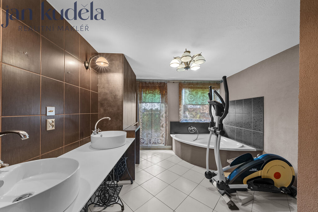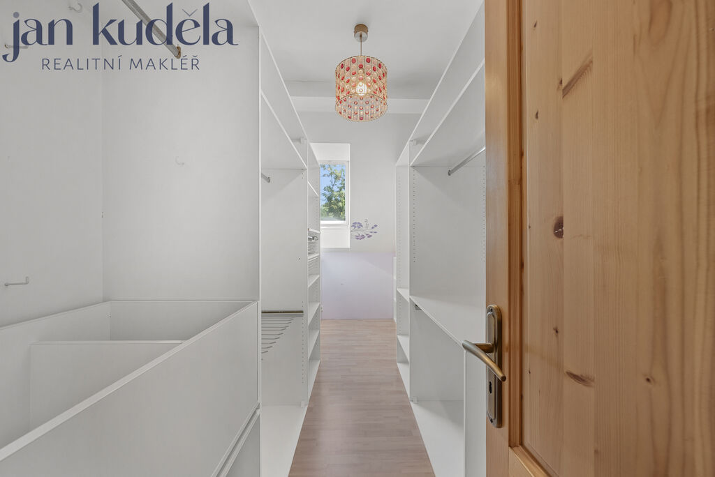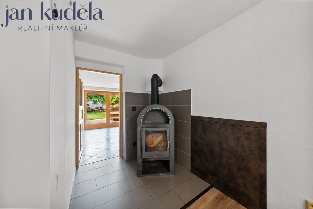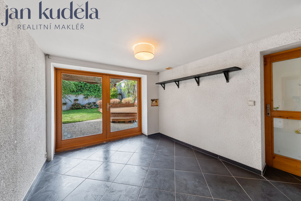 V přízemí se nachází zádveří, ze kterého vstupujete do prostorného obývacího pokoje s krbem. Odtud je přístup do zimní zahrady, ze které se dostanete přímo na zahradu nebo do dílny a garáže. Z obývacího pokoje se dále vchází do kuchyně s jídelnou, odkud je opět vstup na zahradu. V přízemí se nachází také první koupelna. Po dřevěném schodišti se dostanete do patra, kde se nachází tři ložnice, šatna, pracovna a druhá koupelna. Z jedné z ložnic a také z horní koupelny je přímý vstup na nedokončenou terasu, která čeká na nové majitele a jejich představy o tom, jak prostor dále využít – ať už jako místo k relaxaci či pro další prostor pro zeleň.