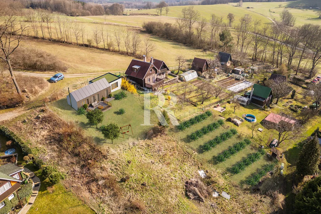 Na pozemku se aktuálně nachází menší dřevěná chatka, několik vzrostlých stromů a keřů, které dotvářejí příjemnou atmosféru tohoto místa.