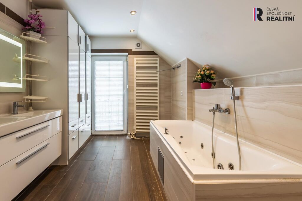 V prvním patře jsou 4 ložnice a koupelna s balkónkem s výhledem na zahradu. Zahrada se vzrostlými stromy má příjemnou velikost na údržbu 122 m2 a zajišťuje dostatečné soukromí.