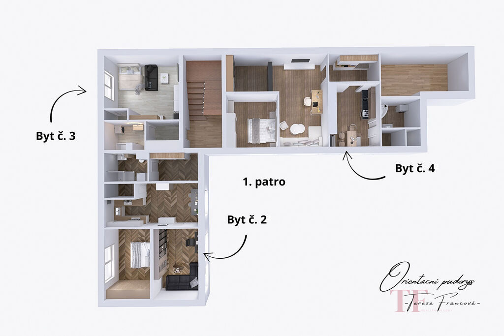 Byt č. 3 – 1+kk, cca 33 m² (1. patro)