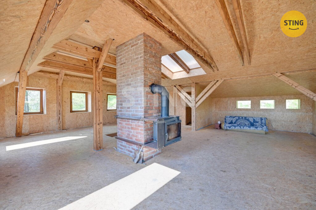 Podkroví (2. NP, užitná plocha cca 78 m2): Otevřený prostor s možností vybudování dalších samostatných obytných místností a sociálního zázemí, charakteristický opalovanými trámy a ateliérovým oknem.