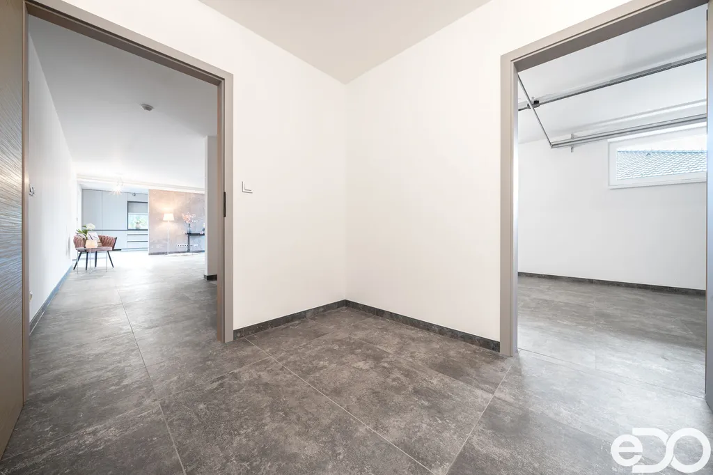Skvělá dispozice domu nabízí prostorný obývací pokoj s kuchyňským a jídelním koutem, kde se nachází na míru vyhotovená designová kuchyňská linka včetně špičkových spotřebičů francouzské značky DE DIETRICH: trouba, mikrovlnná trouba, varná deska, integrovaná digestoř v horní skříňce, plně integrovaná myčka a lednice s mrazákem. Ze strany kuchyně i obývacího pokoje je aplikována betonová stěrka a stěna je připravena na umístění jídelního stolu. Z velkolepého obývacího pokoje je vstup na venkovní terasu, kde si budete v klidu a pohodě užívat slunných dnů. V domě se dále nachází samostatná část zahrnující ložnici se šatnou a menší koupelnou se sprchovým koutem a toaletou, dva dětské pokoje, velká koupelna s vanou a toaletou a další místnost využívaná jako šatna nebo prádelna. Dostatečné prosvětlení ložnice a dětských pokojů zajišťují dvoukřídlová francouzská okna. Okna a dveře jsou plastová, zasklená izolačním trojsklem. Vytápění je zajištěno tepelným čerpadlem, v celém domě je teplovodní podlahové topení. Velkou přidanou hodnotou tohoto domu jsou venkovní žaluzie dělané na míru, které využijete ve dne i v noci a které chrání vaše soukromí a vytváří příjemné prostředí. Garážová vrata mají inteligentní pohon ovládaný mobilní SmartHome aplikací SOMweb. Dům je vybaven zabezpečovacím a kamerovým systémem JABLOTRON. Přívod pitné vody vodovodní přípojkou, kanalizační přípojka tlaková a dešťová akumulační jímka. Dům má valbovou střechu, s pochozím půdním prostorem. Venkovní povrch v okolí domu je řešen betonovou zámkovou dlažbou, která se nachází jak na zadní terase, tak na parkovacím stání před garáží a na chodnících kolem domu.