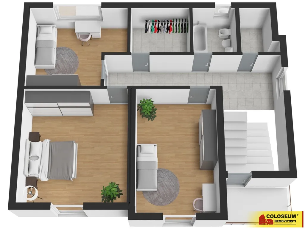 V přízemí domu využijete prostorný obývací pokoj s odděleným kuchyňským koutem, ze kterého vyjdete do zahrady. Dále samostatný pokoj, koupelnu s vanou i sprchovým koutem společnou s toaletou. Přes halu se schodištěm vyjdete do patra, kde jsou tři neprůchozí ložnice, dvě šatny a koupelna společná s toaletou. k dispozici máte dvě zádveří při vstupu do domu z ulice i ze zahrady, kde si můžete odložit.
