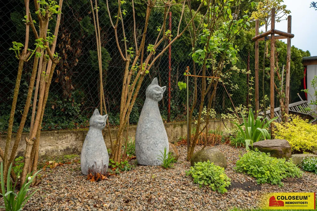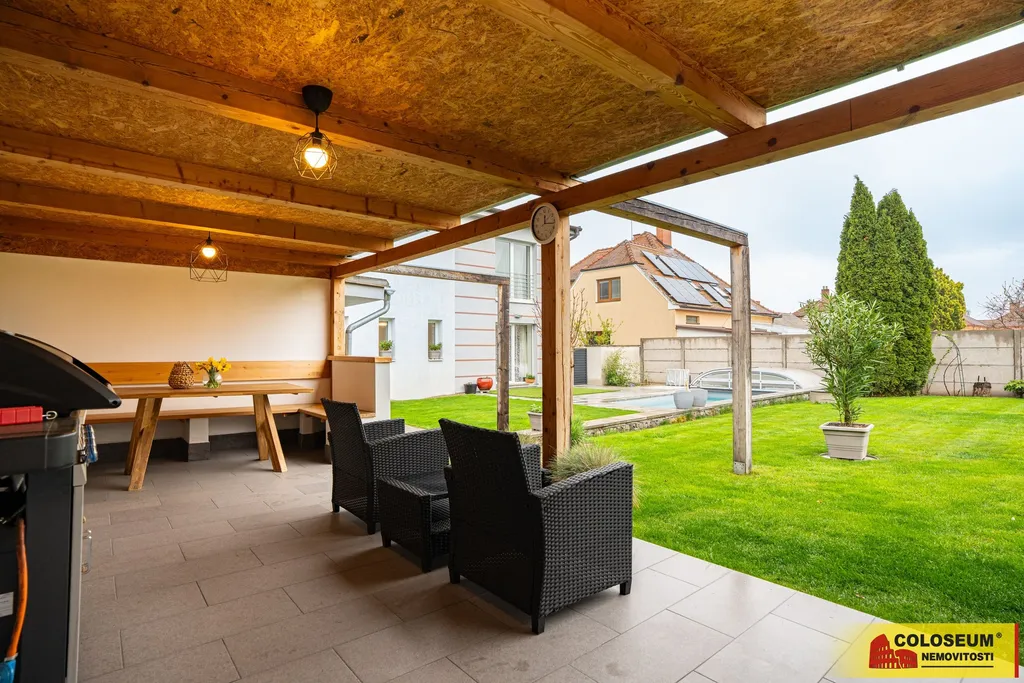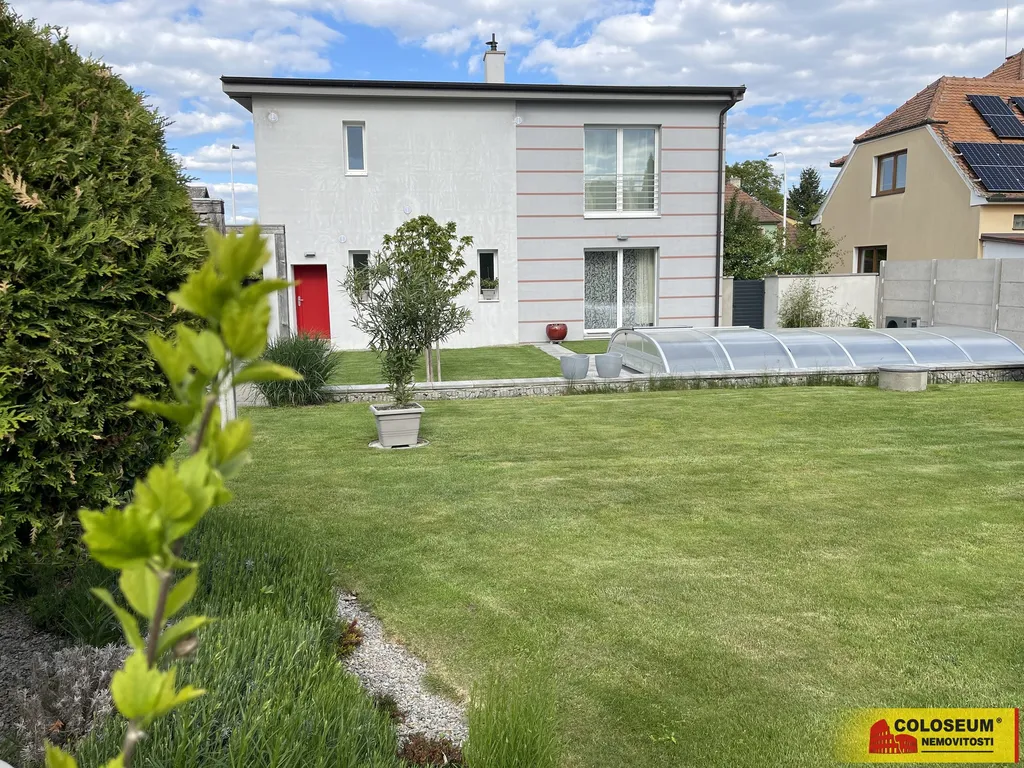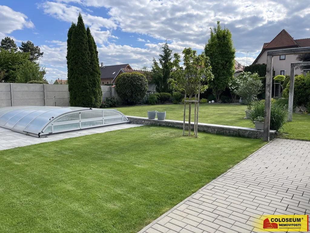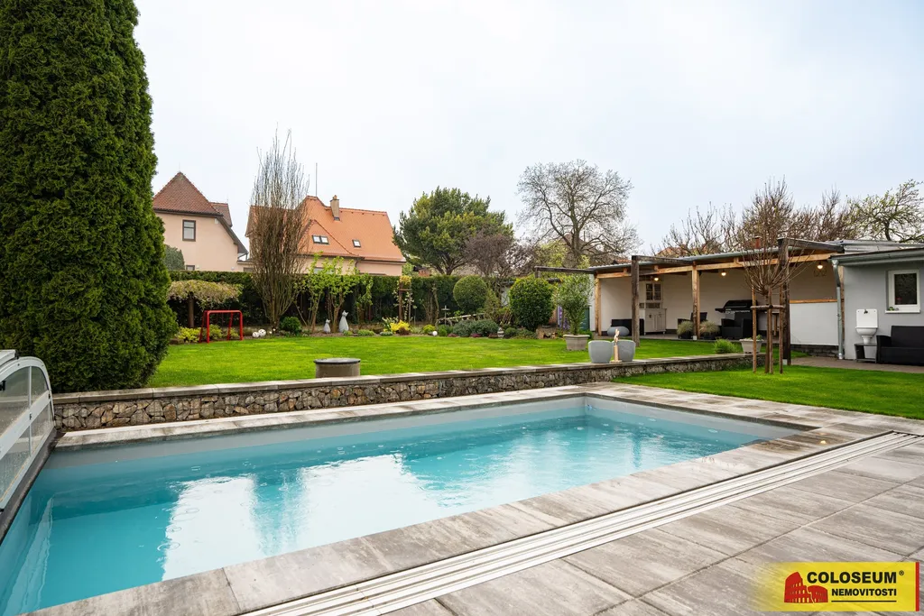 Na pozemku o výměře 760 m² se nachází krásně udržovaná zahrada s okrasnými záhony. Zahradu a terénní úpravy navrhovala zahradní architektka. Užijete si bazén o rozměrech cca 6 × 3 m se slanou vodou a zastřešením, který jistě potěší během horkých letních dní. Díky tepelnému čerpadlu a vyhřívání si můžete užívat koupání i v chladnějších měsících. Filtraci ovládáte automaticky přes mobilní telefon. Na bazén navazuje terasa, která spojuje bazén s domem. K dispozici je také zahradní domek, letní kuchyň, automatický zavlažovací systém a příprava na instalaci solární sprchy – to vše pro maximální pohodlí a úsporu energií. Parkování zajištěno v garáži a na vlastním pozemku - na parkovací plochu vedle domu vjedete bránou na elektrický pohon.