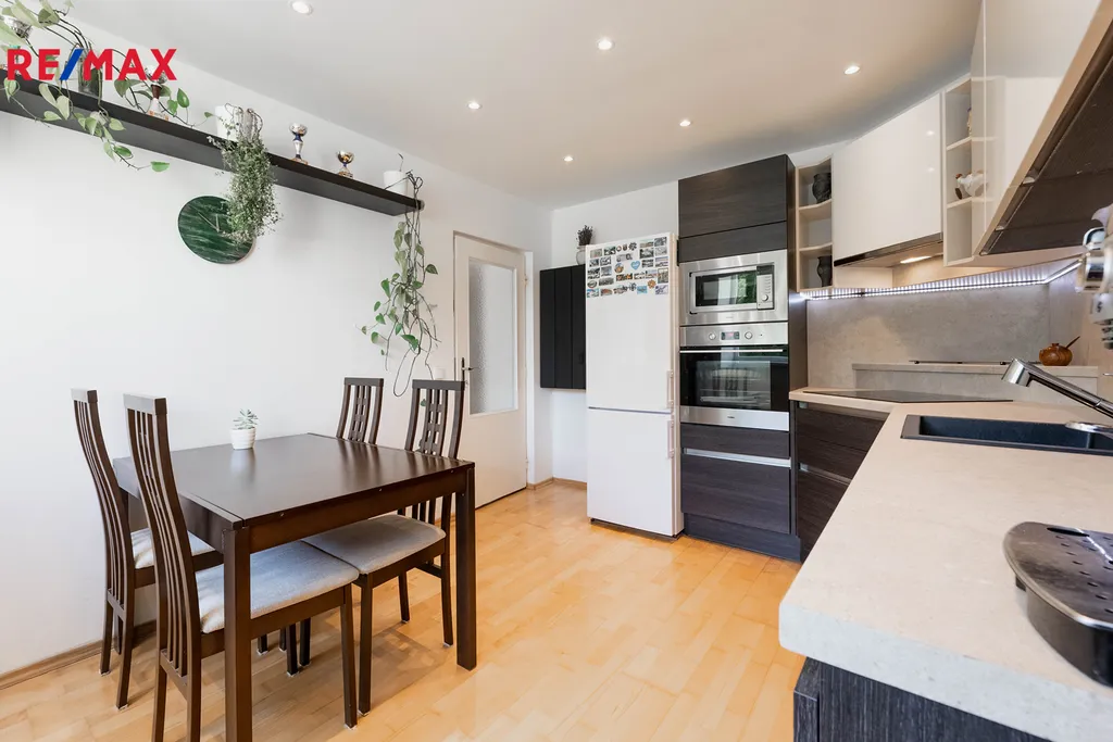 Moderní kuchyň o výměře 12,69m2 s výhledem do dvora, jsou zde zabudované spotřebiče - myčka nádobí, el, trouba, odsavač, indukční varná deska, mikrovlnná trouba, bezúchytkový systém a podsvícení linky, které by zůstávaly součástí prodeje. V koupelně 9.08m2 se nachází podlahové topení, je velmi prostorná, je zde masážní vana, sprchový kout, umyvadlo a WC.