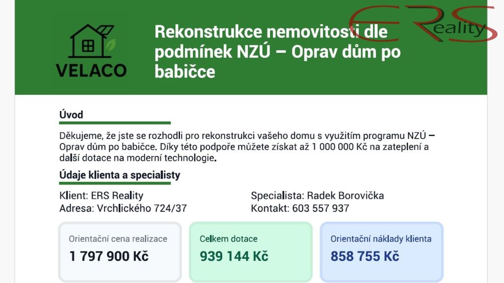- Zpracovaný návrh s kalkulací snížení energetické náročnosti budovy z dotačního programu - nová okna, zateplení fasády, tepelné čerpadlo