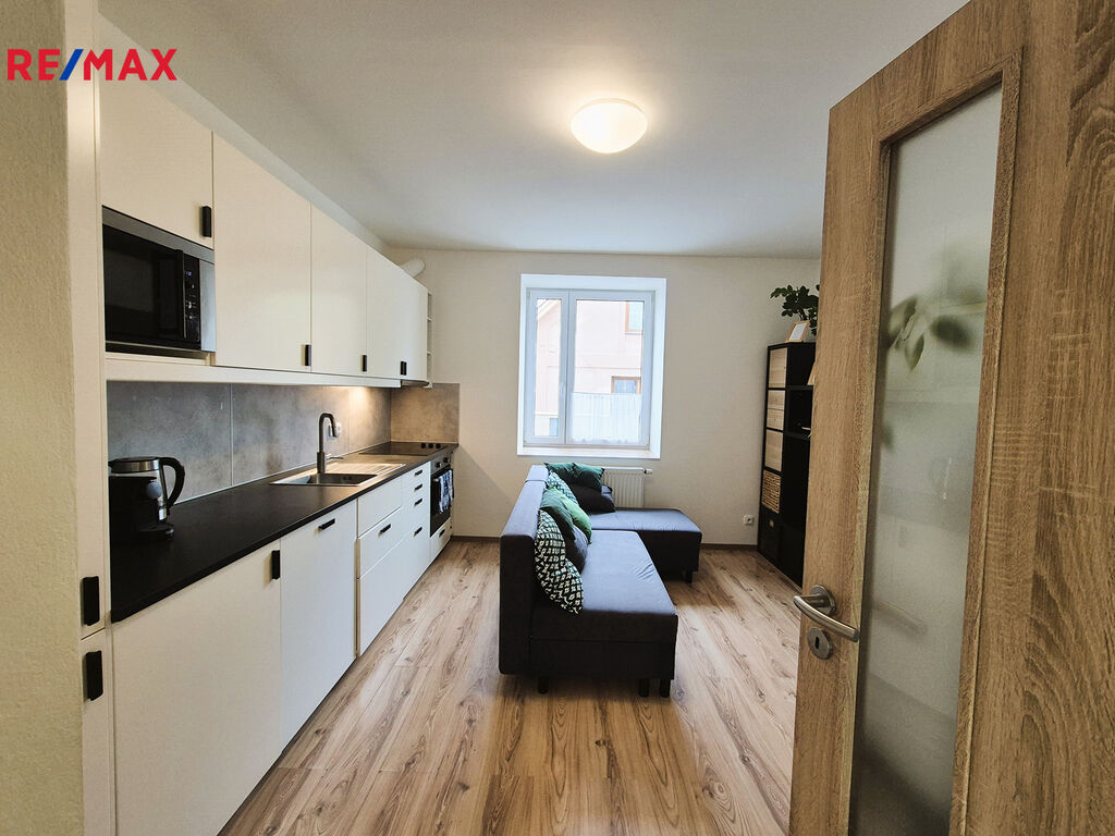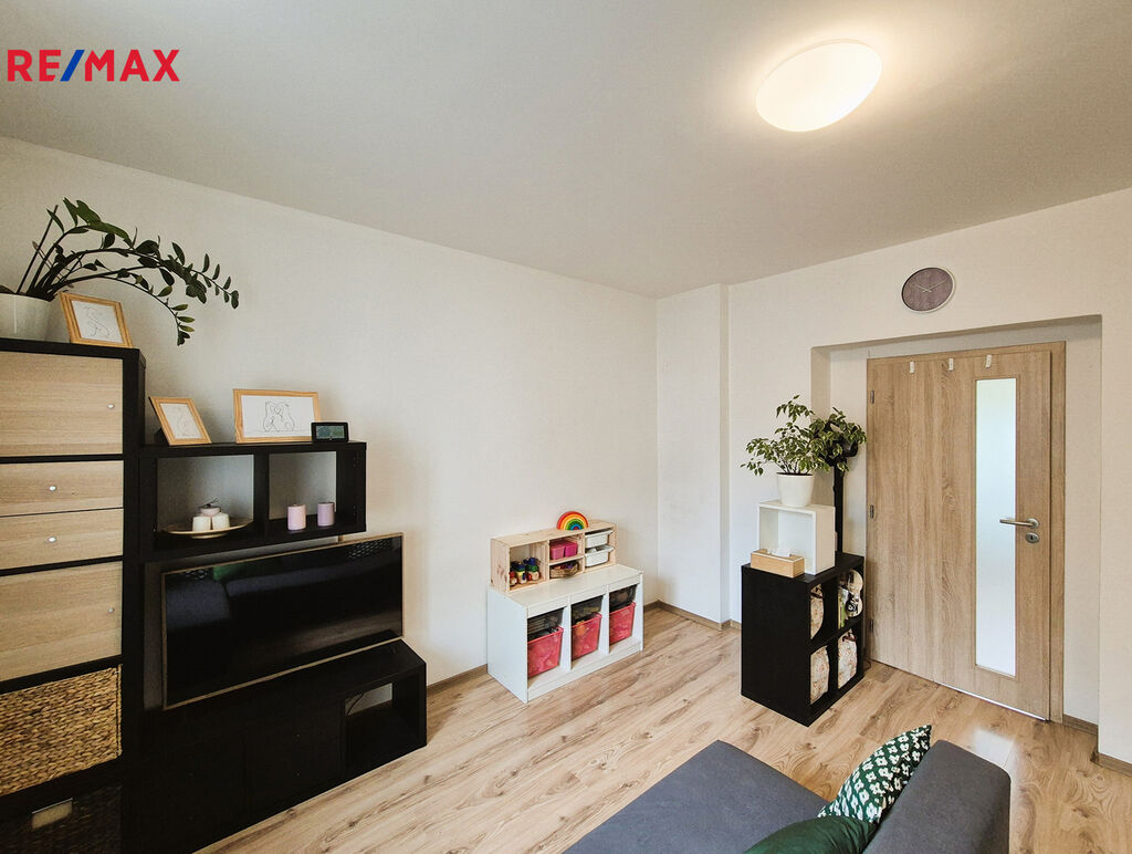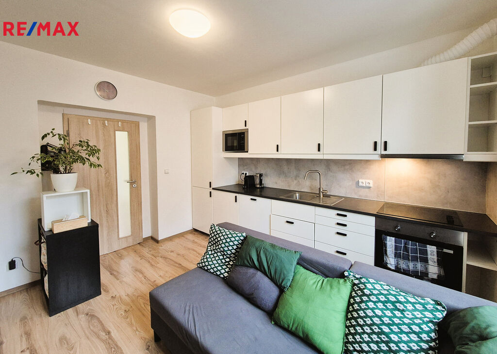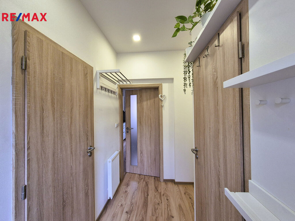 Za vstupem do bytu je vlevo vstup do koupelny se sprchovým koutem a vpravo do samostatného WC. Dále vpravo pokračuje prostor předsíně, odkud je vstup do úložného prostoru, šatny a do ložnice o ploše cca 9 m2. Přímo proti vchodu do bytu je vstup do obývacího pokoje o ploše cca 16m2 s kuchyňským koutem (kompletně vybavená kuchyňská linka s dřezem, vestavěnou lednicí a elektrickým sporákem s varnou sklokeramickou deskou, horkovzdušnou troubou a digestoří).