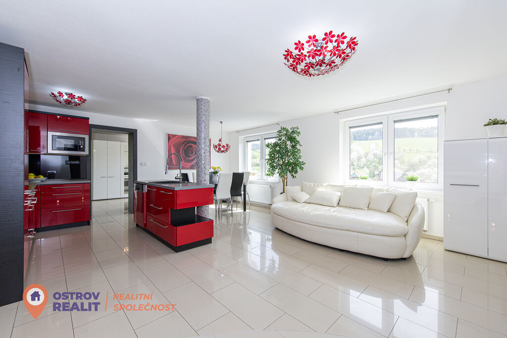 Dispozice: přízemí (4+2) se dvěma kuchyněmi, obývacím pokojem, ložnicí a koupelnou; patro (4+kk) s moderní kuchyní propojenou s obývacím pokojem, třemi pokoji a dvěma koupelnami.