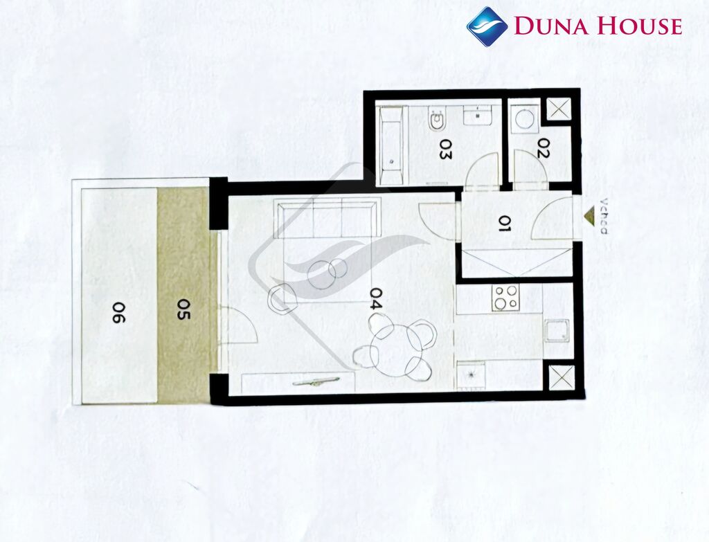 Dispozice bytu zahrnuje vstupní předsíň s vestavěnou skříní, prostorný pokoj s moderní kuchyňskou linkou (lednice, trouba, indukční varná deska, myčka, digestoř) a přímým vstupem na předzahrádku. Dále koupelnu s vanou a toaletou a samostatnou technickou místnost s pračkou. Podlahy jsou pokryty vinylem a dlažbou. Plastová okna s venkovními žaluziemi jsou orientována na severovýchod.
