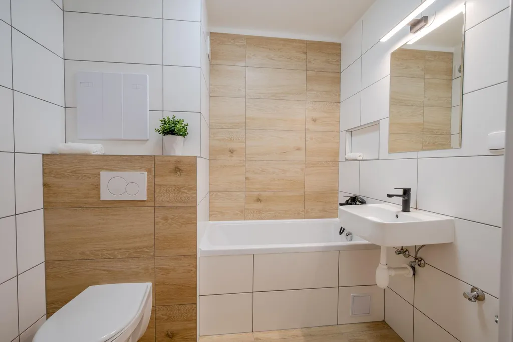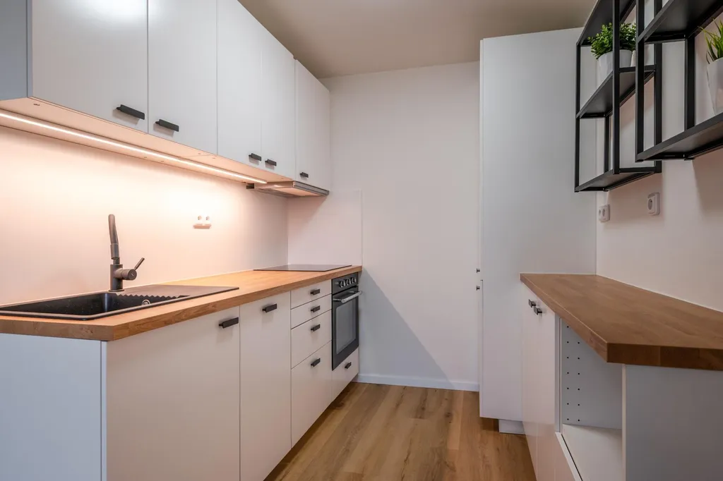 Kompletní rekonstrukce je velmi povedená. Interiéru dominuje bílá barva, kterou doplňuje dřevěný dekor podlah a obkladů, kontrast dodávají černé kovové prvky (police, kování, úchyty, baterie, dřez či svítidlo). Kuchyňská linka Ikea je prakticky řešena po obvodu dvou stěn, má dostatek úložných prostor, velkou pracovní i odkládací plochu a zahrnuje všechny potřebné spotřebiče (myčka, lednice, mrazák, pečící trouba, varná deska, digestoř).