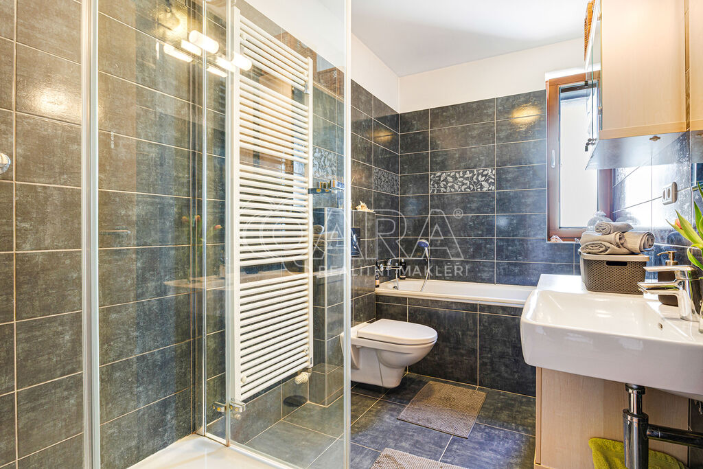V horním patře domu se nachází velká manželská ložnice s další terasou. Ve středním patře mohou být dva dětské pokoje - aktuálně jsou ale spojené v jeden velký pokoj. Na patře se dále nachází koupelna s vanou. Pokoj pro hosty s druhou koupelnu se sprchovým koutem a komoru pak najdete v nejnižším podlaží domu. Z pokoje pro hosty je možné se přes venkovní schodiště projít na zahrádku. V domě jsou instalovány tři velké vestavěné skříně.