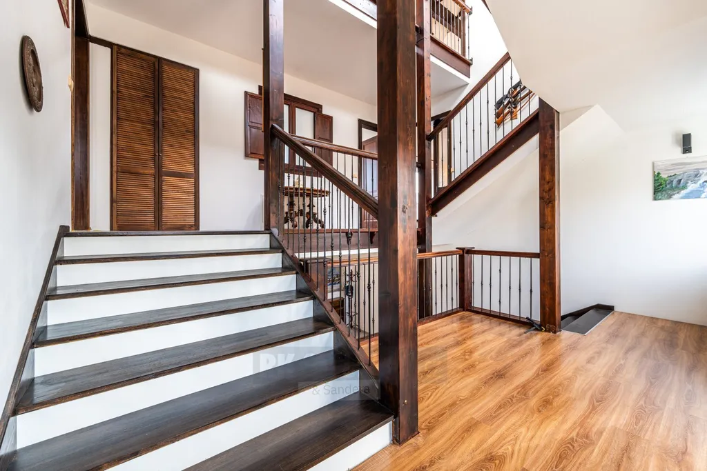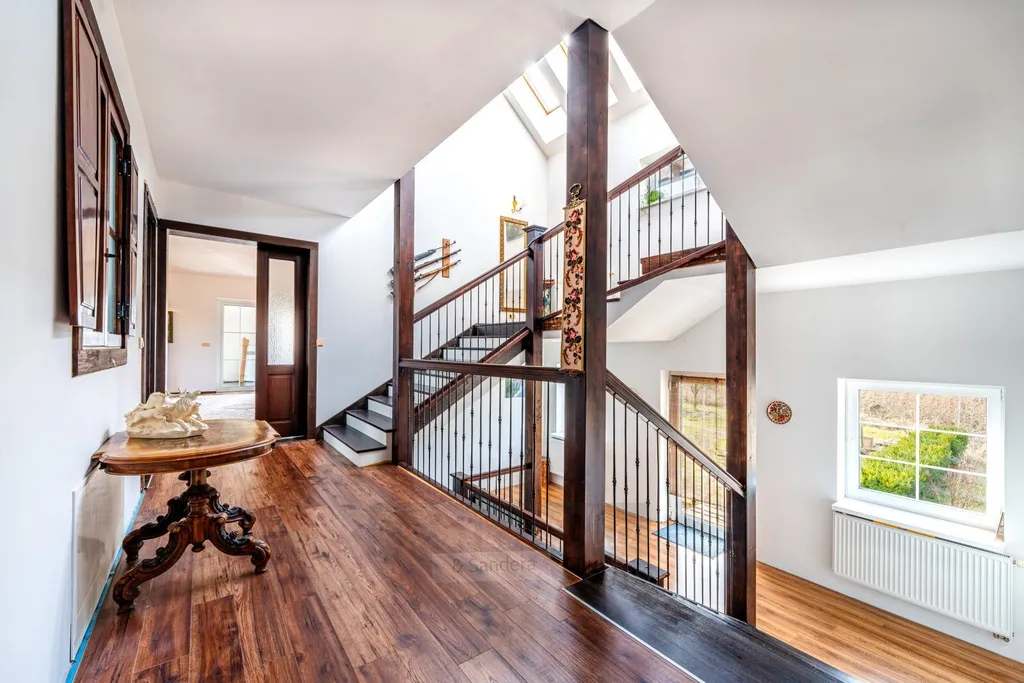 Veškeré dřevěné konstrukce a prvky, všechny stupně schodiště, interiérové dveře a kuchyňská linka jsou vyrobeny výhradně z přírodního masivního modřínu, dubu, buku nebo smrku ve střešních trámech.