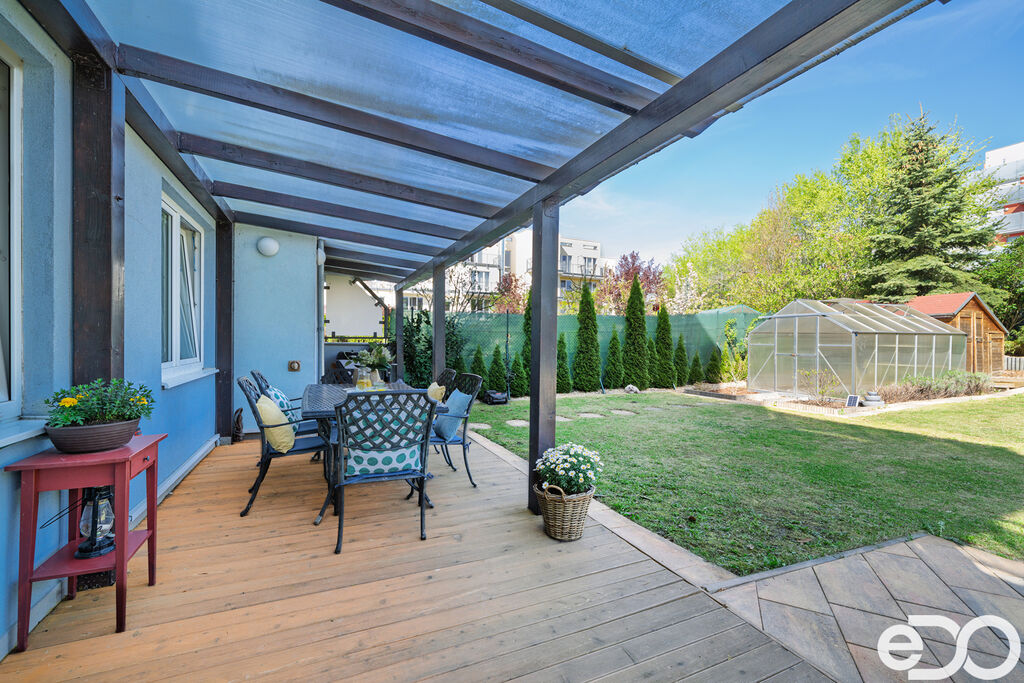 Hlavní předností nemovitosti je určitě krásná zahrada o velikosti 335 m², která poskytuje dostatek prostoru k relaxaci i trávení volného času s rodinou a přáteli. Součástí zahrady je ještě zastřešená terasa o velikosti 22,5 m² a útulná zimní zahrada o velikosti 15 m².