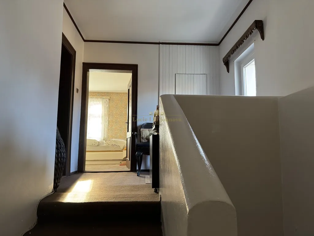 Základní popis domu: v podkroví se nachází dvě ložnice, chodba, dále menší úložný prostor - komora. V mezipatře u schodiště je vstup do pokoje s lodžií, který nabízí příjemný výhled do zahrady. V přízemí domu je vstupní chodba, dále koupelna s vanou a umyvadlem, samostatné WC. Prostor kuchyně s jídelnou a komorou, ze které se dále vchází do obývacího pokoje, zajišťuje pohodlný a praktický propojený prostor pro každodenní život. Dům je zčásti podsklepen, jedna sklepní místnost o výměře kolem 5 m2. K dispozici je původní zaměření domu z roku 1924, současně zaměření v rámci přístavby z roku 1985.