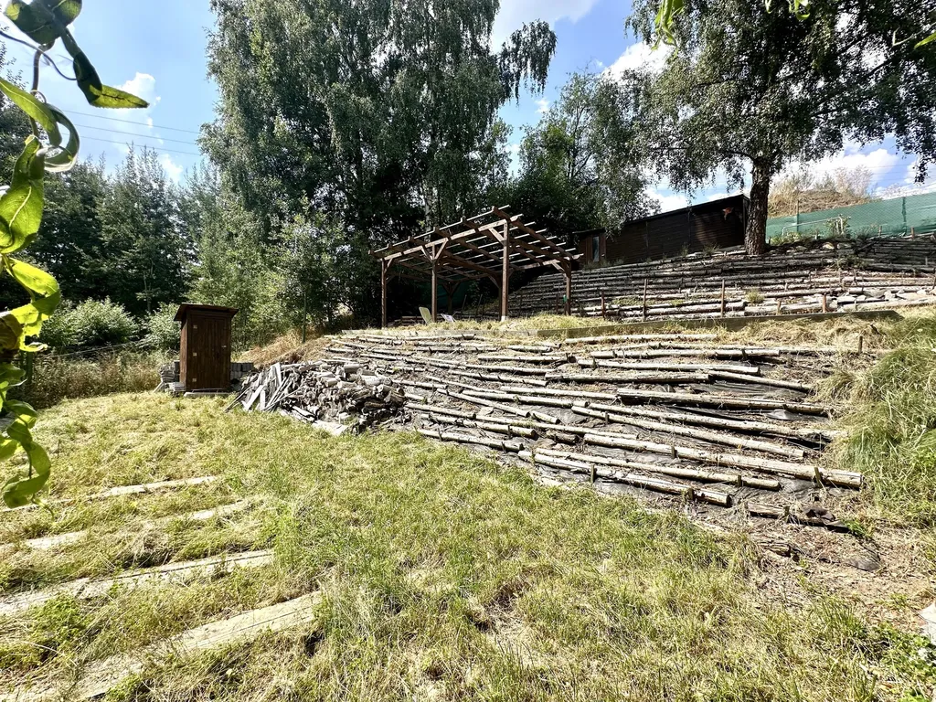 Okolí chaty je vydlážděné, před chatou je vybudovaný sklípek. Vodu na zalévání je možné čerpat z veřejné studny v blízkosti pozemku, voda není zavedena do chaty. Zahrada je ve svahu, terén je upravený. Pozemek je osazen keři a nabízí možnost pěstování. Zahrada je oplocena částečně a nabízí výhled do okolní krajiny. Tato nabídka je vhodna k odpočinku a rekreaci.