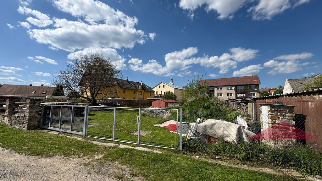 Popis: slunný, rovinatý, oplocený, kompletně zasíťovaný pozemek do tvaru „L“ s plechovou garáží (zázemí ke stavbě) a stavebním materiálem (kameny - balvany, dlažební kostky, štěrk, trámy a prkna, zemina – skrývka), který není součástí prodeje, avšak lze se domluvit na odkupu anebo odvozu majitelem.