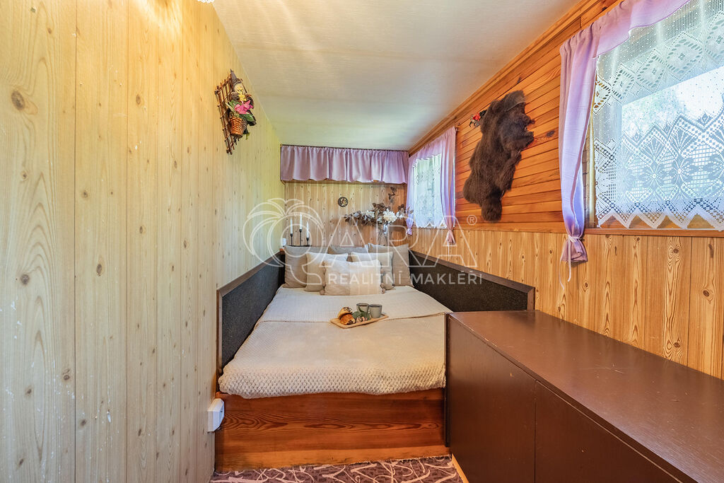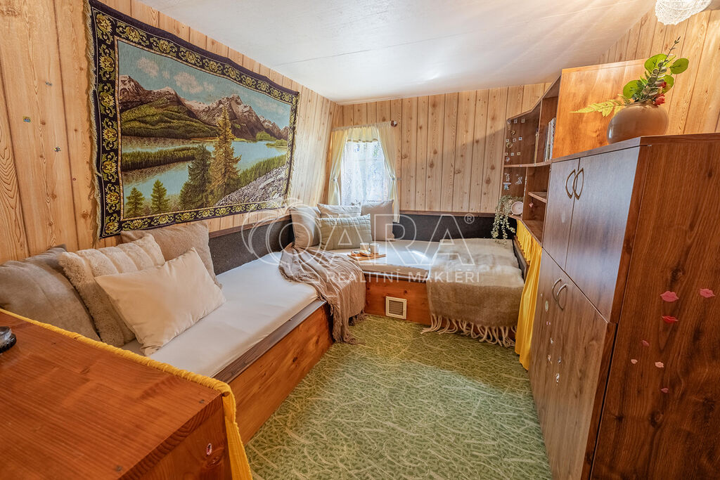 A teď k samotné nemovitosti. Rodinný dům (chata) o dispozici 3+1 s menší pracovnou a užitnou plochou přibližně 60 m² se nachází na adrese Smrčí 66 v obci Záhoří. Dispozičně je dům řešen velmi efektivně, najdete zde dvě samostatné ložnice o velikosti 5,9 m² a 6,9 m², menší pracovnu 4,4 m², útulný obývací pokoj s krbem o rozloze 15,2 m², kde se pohodlně vyspí další hosté, samostatnou kuchyňku 5,7 m², koupelnu s rohovou vanou a toaletou 3,7 m², komoru, zádveří 4,9 m² a předsíň 8,5 m².