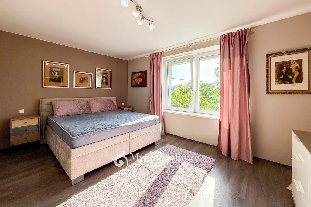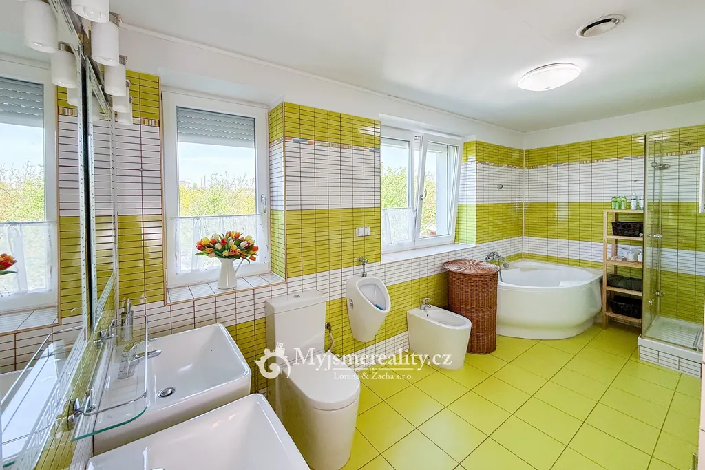 V patře vás přivítá klidová část s třemi komfortními ložnicemi, elegantní koupelnou s vanou i sprchovým koutem a samostatnou šatnou. Suterén nabízí rozmanité možnosti využití – od wellness centra přes domácí fitness, vinný sklípek až po soukromý klub nebo ateliér.