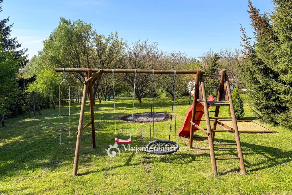 Součástí domu je také dvojgaráž, technologie pro bazén a pečlivě navržená zahrada s množstvím prvků pro relaxaci i zábavu. Nechybí zde ovocné stromy, dětské hřiště se skluzavkou a houpačkami, zahradní domek, sportovní plocha ani ohniště pro rodinná setkání.