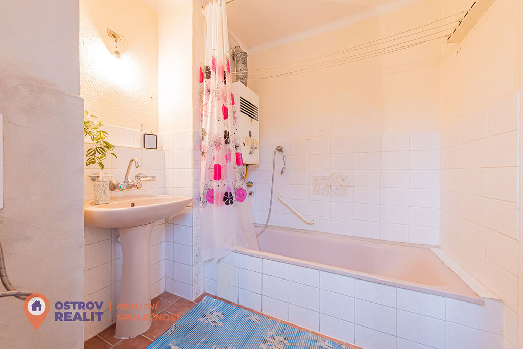 Ohřev teplé vody je řešeno plynovou karmou, která je umístěná v koupelně.