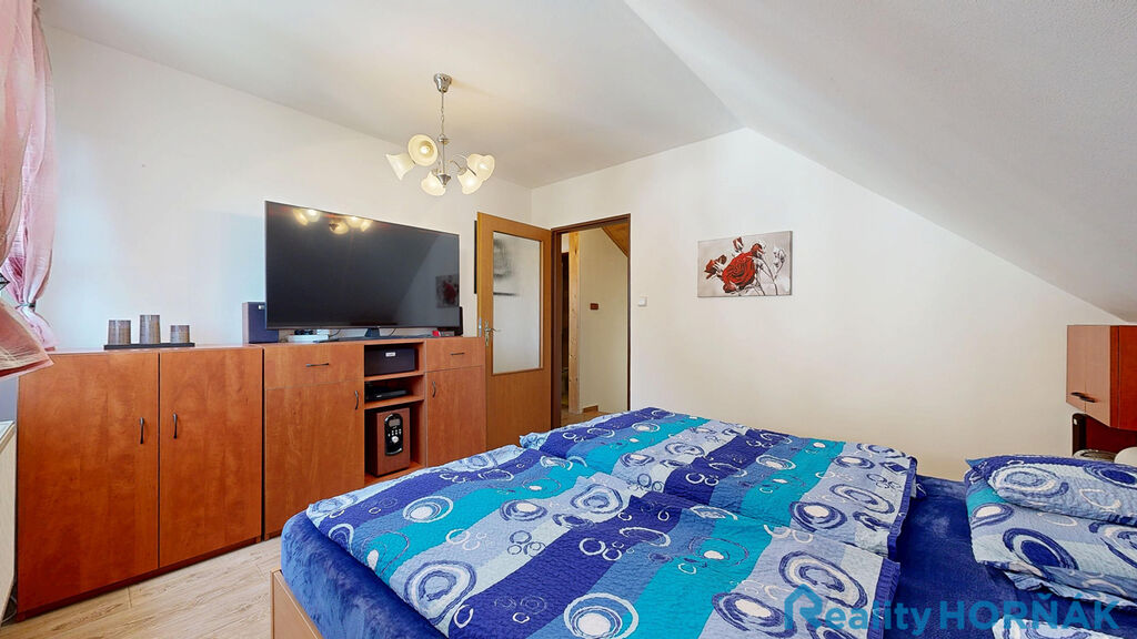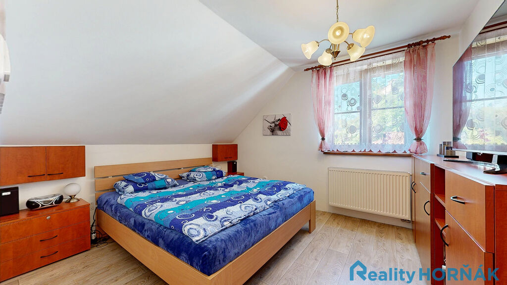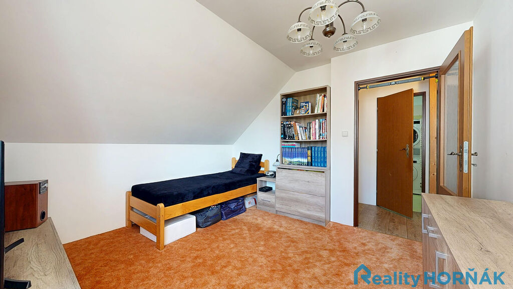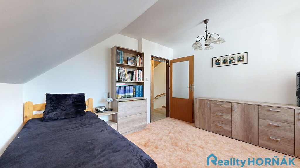 Po pohodlném schodišti vystoupáme do prvního patra rodinného domu s místnostmi: středové chodby (4,7 m2), dvou samostatných pokojů (15,1 m2 a 17,3 m2) s výstupem na krytý balkon – lodžii(13,3 m2), dalších dvou samostatných pokojů (13,3 a 12,01 m2). Ze středové chodby je přístupná samostatná místnost WC (2,65 m2) s klosetem, umyvadlem a místem pro pračku a sušičku (tuto místnost lze uzpůsobit jako druhou koupelnu.