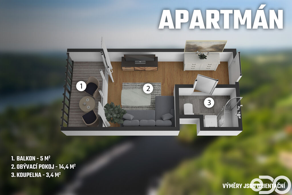 Jednotka má výměru cca 18 m² + balkon 5 m², je vedená jako nebytový prostor a je využívána k rekreačním účelům. Součástí je koupelna se sprchovým koutem a toaletou, hlavní obytný prostor a vlastní balkon orientovaný do oplocené části bytového domu. K apartmánu patří také sklepní kóje o velikosti 1,7 m² , která poskytuje praktické úložné místo například pro sportovní vybavení. Všechny výměry jsou pouze orientační.