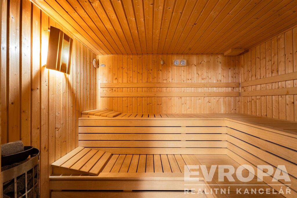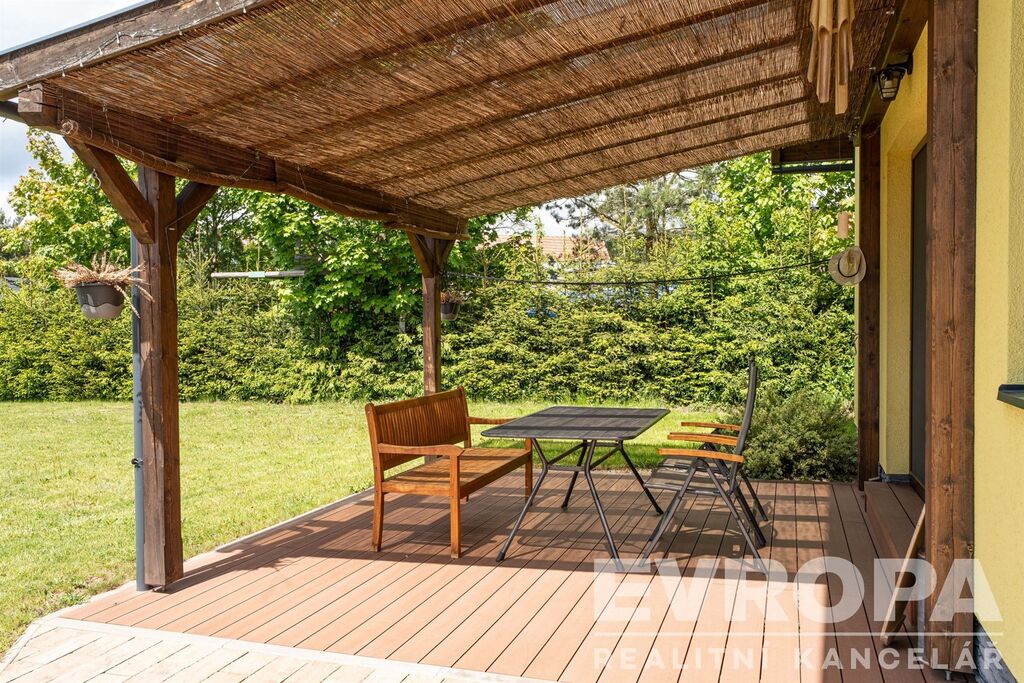 Zahrada je velmi vkusně upravená a nabízí kromě terasy také zapuštěný bazén, skalku, okrasné keře, zahradní domek, dětské hřiště, ohniště a vinný sklípek. Komfort domu dále zvyšuje samostatně stojící garáž, kde se také nachází vlastní wellness vybudované v roce 2016, které zahrnuje finskou saunu, ochlazovací bazének, odpočívárnu a toaletu.