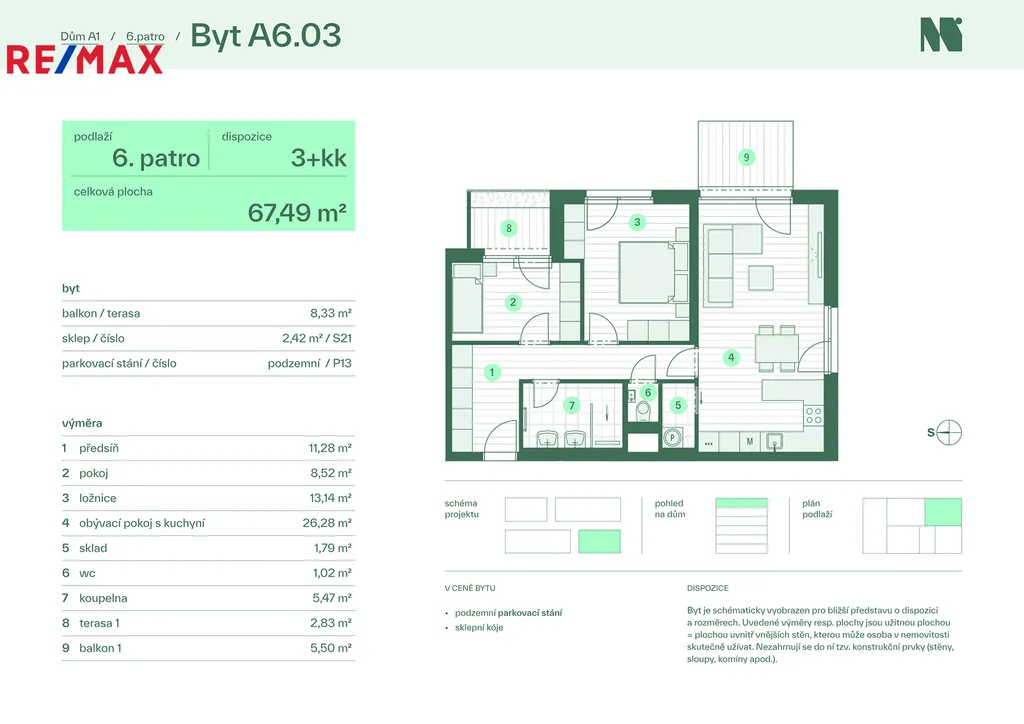 Nabízený byt A6.03 s dispozicí 3kk se nachází v 6.nadzemním podlaží. Užitná plocha samotného bytu je 67,49 m2 plus 2 balkony o celkové výměře 8,33 m2 plus 2,42 m2 sklepní prostory. Součástí ceny je i výhradní vnitřní parkovací stání v suterénu domu.