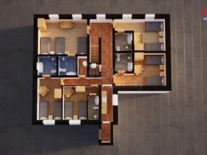 2. patro: 5 pokojů s vlastní koupelnou a WC, kuchyňka, zázemí.