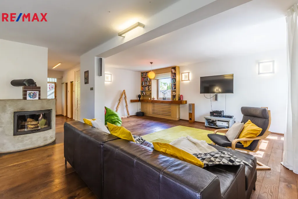 ✓ Prostorný obývací pokoj s atypickým krbem, kuchyňským koutem a spíží (celkem 70 m²)