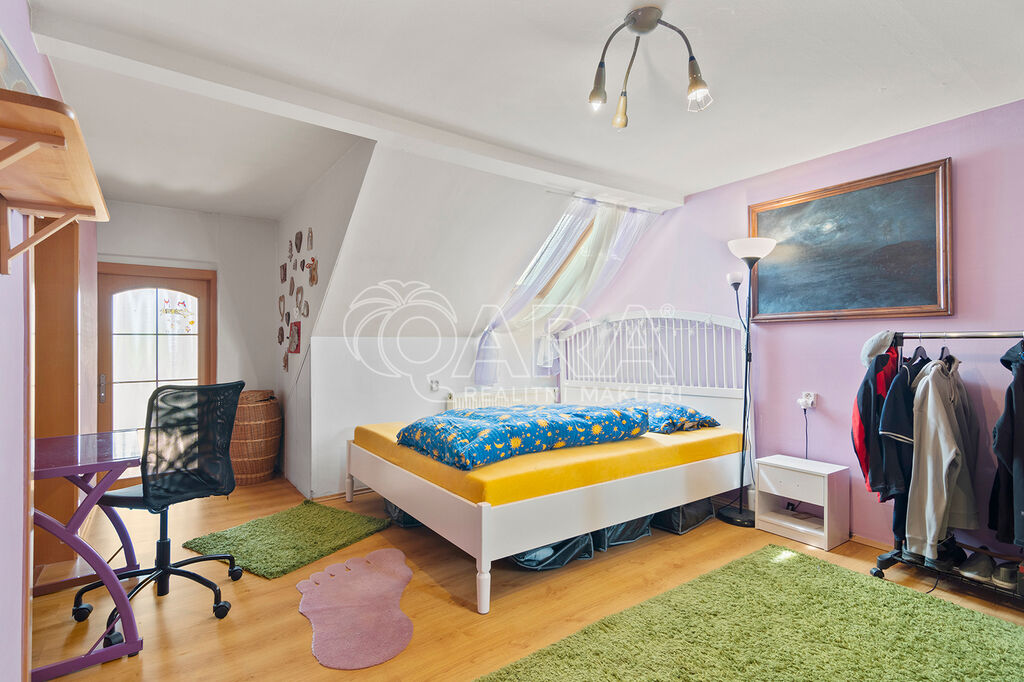 Hlavní dům o celkové ploše 160 m² ve dvou podlažích (1. NP 82,14 m², 2. NP 78,15 m²) se rozkládá na pozemku o výměře 610 m². Dispozičně je řešen jako 5+kk. Ve spodním patře se nachází prostorný obývací pokoj s kuchyňským koutem, ložnice, koupelna, samostatné WC, technická místnost a dvě spíže. V patře pak najdeme tři pokoje, z nichž jeden má samostatnou šatnu a další koupelnu s WC. Dům je napojen na obecní vodovod i kanalizaci. Vytápění domu a ohřev vody zajišťuje plynový kondenzační kotel; možnosti vytápění pak doplňují krbová kamna v obývacím pokoji.