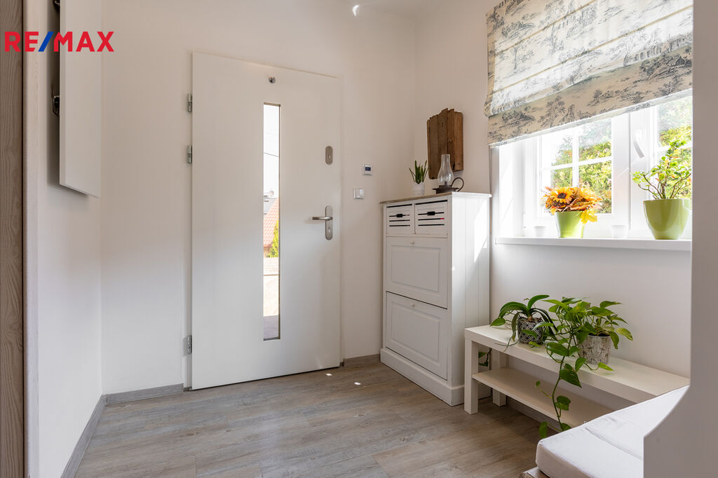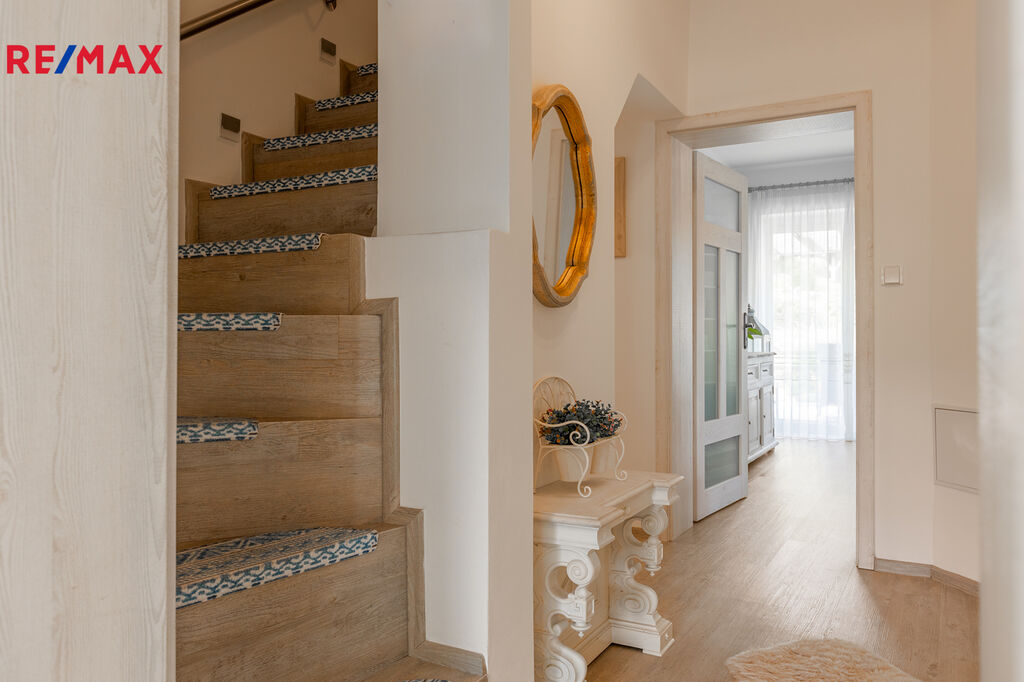 Dům je patrový a promyšleně rozdělený na dvě části. V přízemí se nachází prostorný a světlem zalitý obývací pokoj, propojený s moderní kuchyní vybavenou vestavěnými spotřebiči – radost tu vařit i trávit čas s rodinou. Z obýváku se plynule vstupuje do zimní zahrady, která poskytuje útočiště v každém ročním období. Dále zde najdete ložnici s vlastní šatnou, koupelnu, samostatné WC, útulnou předsíň i praktickou prádelnu.