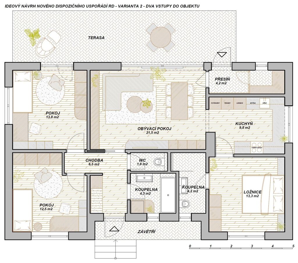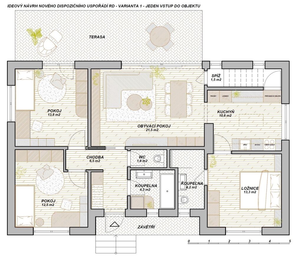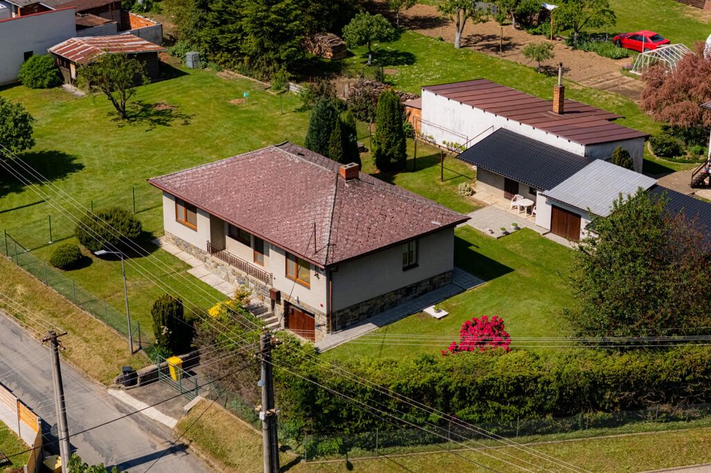 Tento přízemní dům o velikosti 4+1 nabízí dostatek prostoru pro rodinný život. Hlavními obytnými prostory v přízemí jsou čtyři prostorné pokoje, které poskytují flexibilitu při využití – ať už jako ložnice, dětské pokoje, pracovny, nebo odpočinkové zóny. Dále se zde nachází kuchyně, a přilehlá spíž poskytující dostatek úložného prostoru pro kuchyňské potřeby.