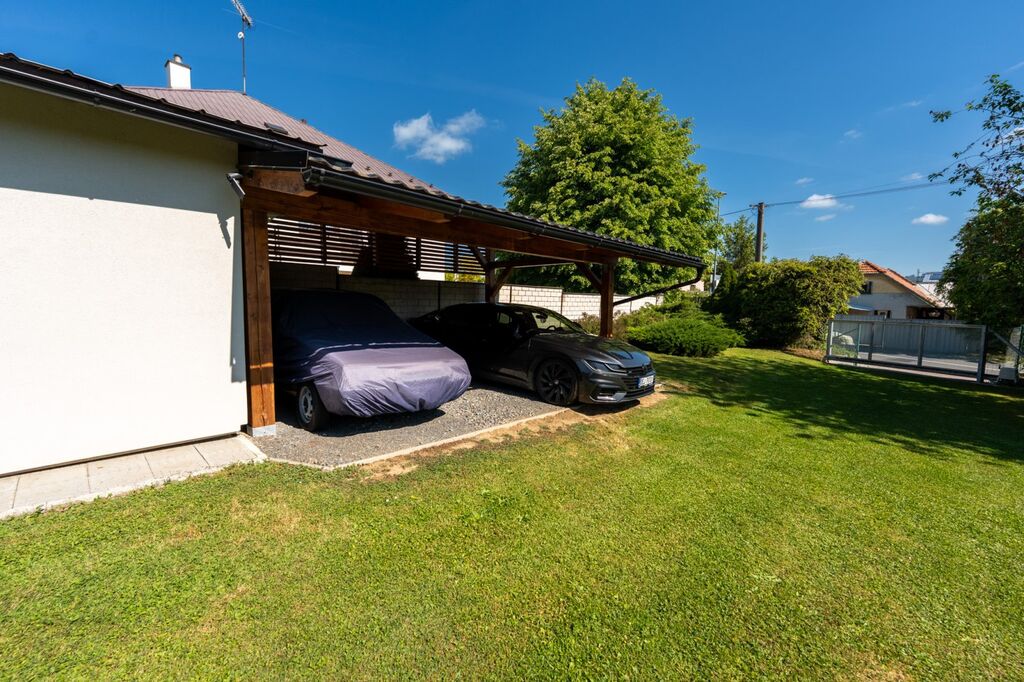 Podzemní podlaží je navrženo s ohledem na praktičnost. Zde najdete garáž, prádelnu, kotelnu a schodiště, které vás pohodlně přivede zpět do obytné části domu. Přístřešek pro dvě parkovací místa nabízí další možnosti parkování pro vás a vaše hosty, což je v dnešní době neocenitelné.