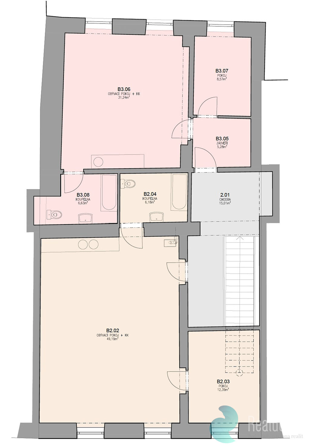 - V prvním patře jsou dva byty 2+kk (52 m2 a 67 m2)  interiérově upravené přibližně před 15 lety. Elektřina i ostatní rozvody v těchto jednotkách jsou v původním stavu.