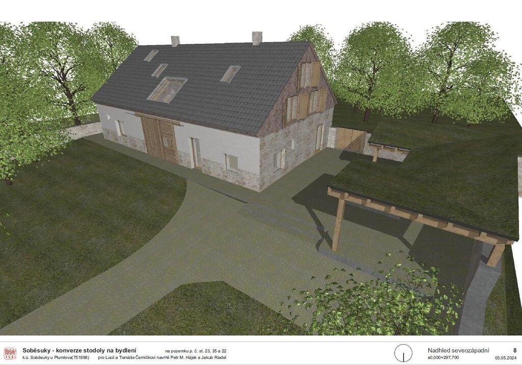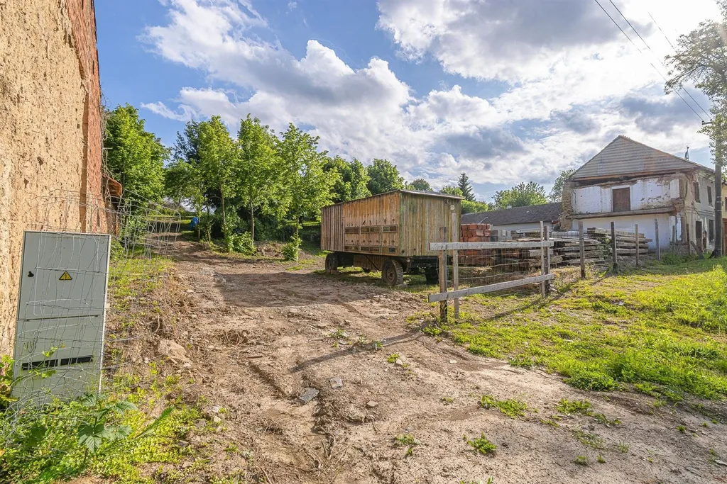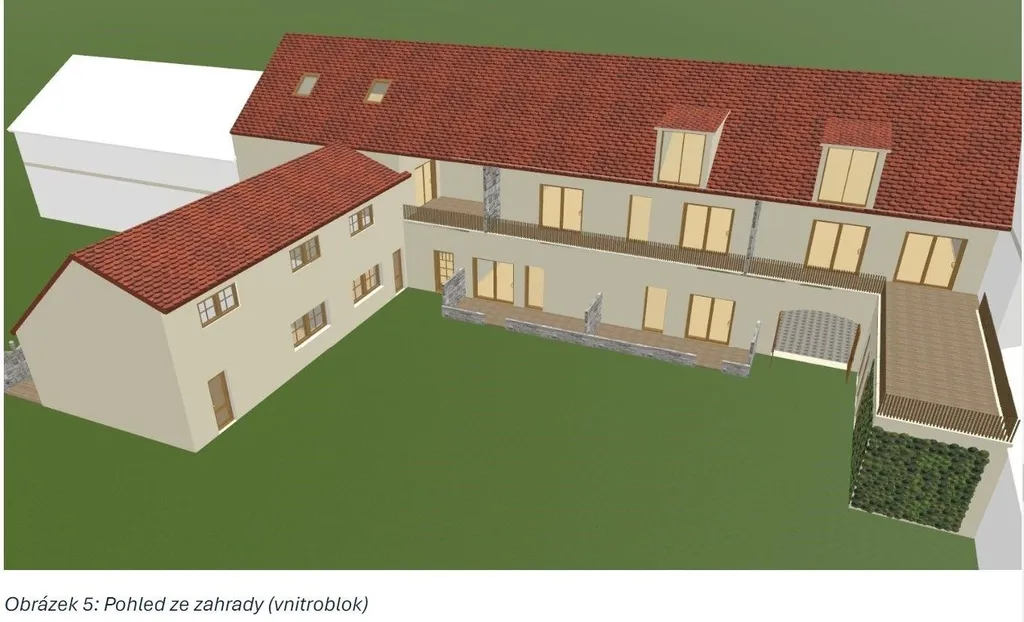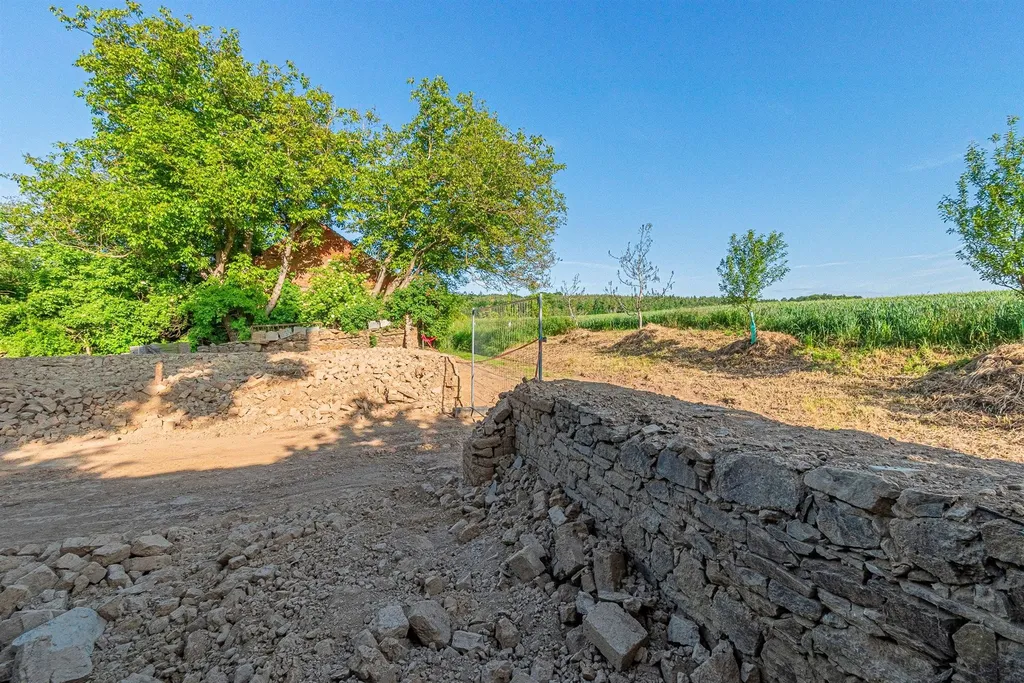 V horní části pozemku, kde dříve stávala kamenná stodola je možno stavět s tím, že projekt na stavbu 51% plochy hospodářské (tj. např. dílna, zemědělství apod....) a zbytek 49% podlahové plochy na bydlení. K tomutu je zpracovaná architektonická studie, kterou chtěli prodávající přestavět pro svoje bydlení.