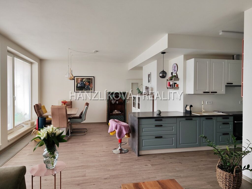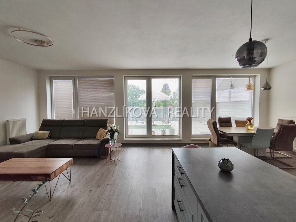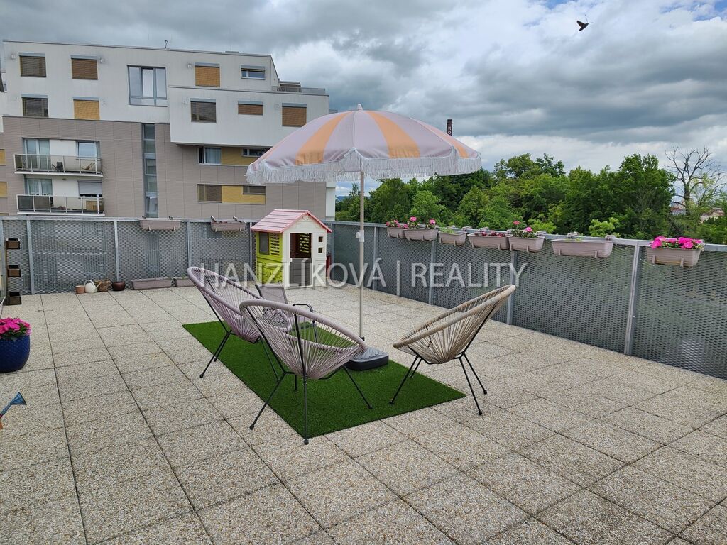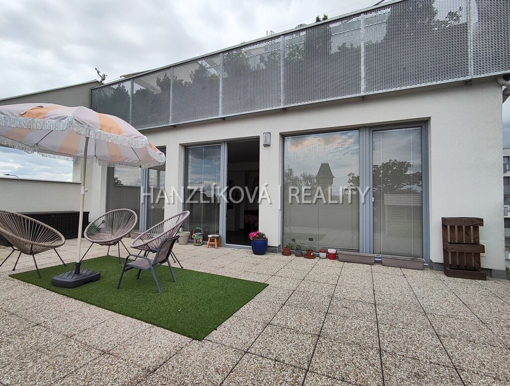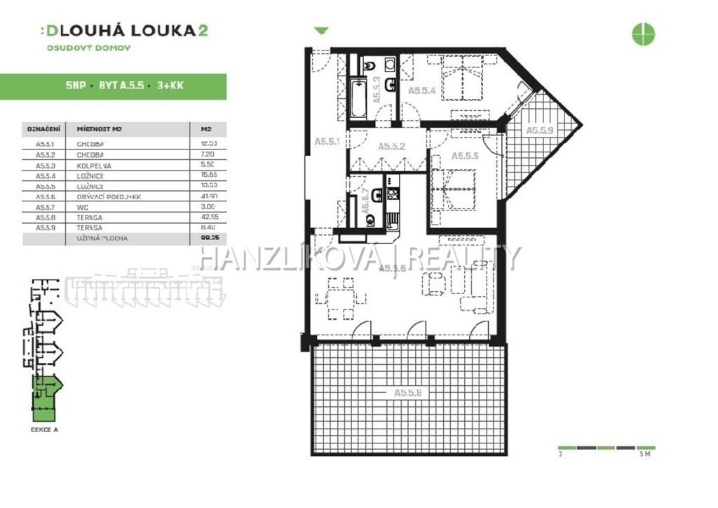 Nabízíme k pronájmu luxusní bytovou jednotku číslo A.5.5. Jedná se o byt 3+kk o výměře 99,25 m2 se dvěma terasami (8,40 a 42,95 m2), který se nachází v 5.NP rezidenčního komplexu DLOUHÁ LOUKA 2.etapa. Byt se skládá z: prostorné předsíně s vestavěnými skříněmi, koupelny s toaletou, dvou samostatných pokojů a obývacího pokoje s kuchyní. Přístup na terasy je ze všech pokojů. Byt je orientovaný na jiho-východ. Byt je pronajímán včetně kompletního vybavení - postele, vestavěné skříně, pohovka, jídelní stůl s židlemi, kuchyňská linka vč. spotřebičů (lednice s mrazákem, trouba, varná deska, digestoř, myčka), v koupelně pračka se sušičkou.
