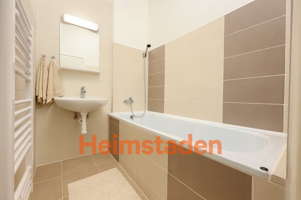 Koupelna je rovněž po kompletní rekonstrukci – najdete zde novou vanu, obklady a dlažbu v moderním dekoru, žebřinové topení i praktické umyvadlo. WC je samostatné. Všechny prvky jsou zcela nové a laděné do svěžího, nadčasového stylu.