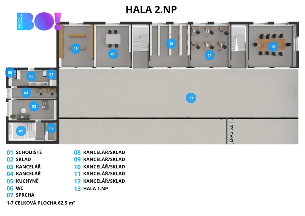 Hledáte místo, kde vaše podnikání poroste a vaše vize dostanou pevné základy? BO! Reality vám s radostí nabízí ke koupi prostornou výrobní halu se skladovacími prostory, kancelářemi a kompletním zázemím pro váš tým. Celková užitná plocha 1 147 m² na pozemku o rozloze 3 049 m² vám dává svobodu tvořit, rozvíjet a růst.