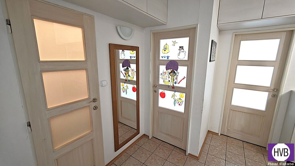 Dispozice bytu zahrnuje dostatečně prostorný obývací pokoj s otevřeným propojením s moderně vybavenou kuchyní a vstupem na lodžii (7 m²), směřující do zeleně. Dále jsou v bytě dvě samostatné ložnice, předsíň se vstupem do všech místností, koupelna s vanou, samostatné WC a komora. K bytu náleží dvě sklepní kóje (3 m²). K dispozici je společná kolárna, přímo před domem se nachází velké parkoviště.