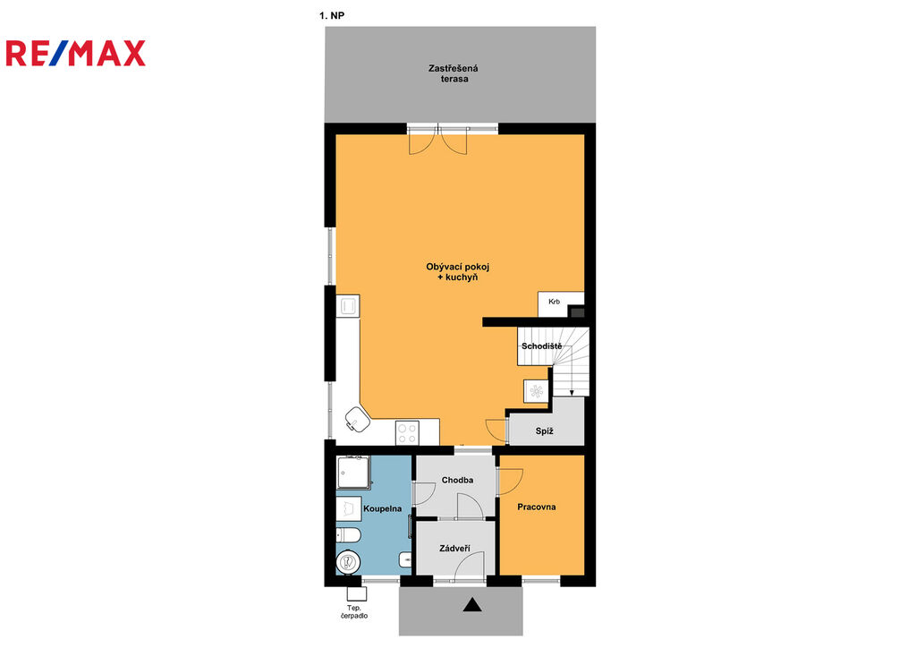 V přízemí se nachází zádveří, prostorný obývací pokoj s kuchyňským koutem a vstupem na terasu, koupelna s masážním sprchovým koutem a toaletou, pracovna/pokoj, schodiště a pod schodištěm spíž.
