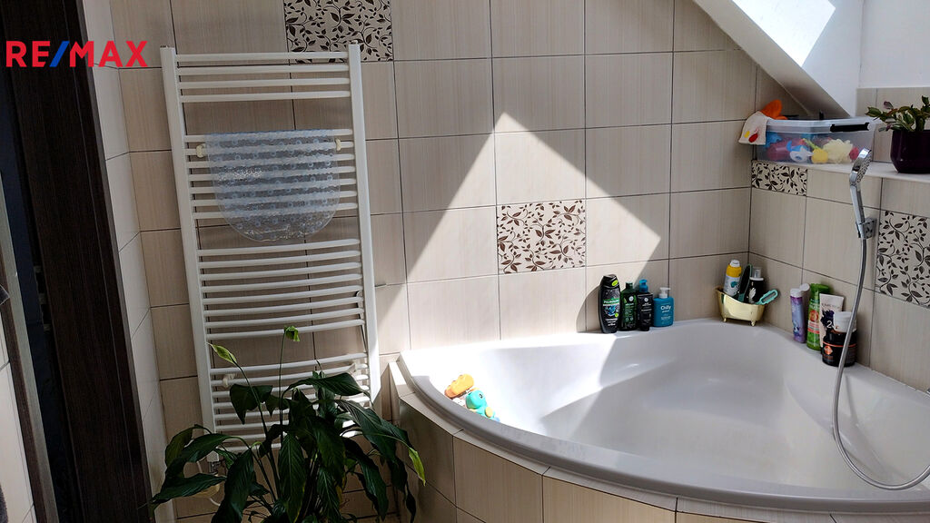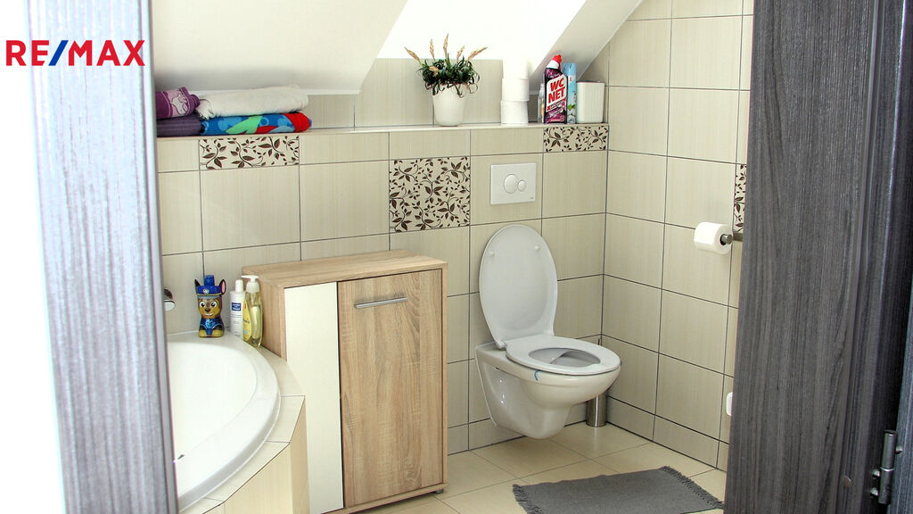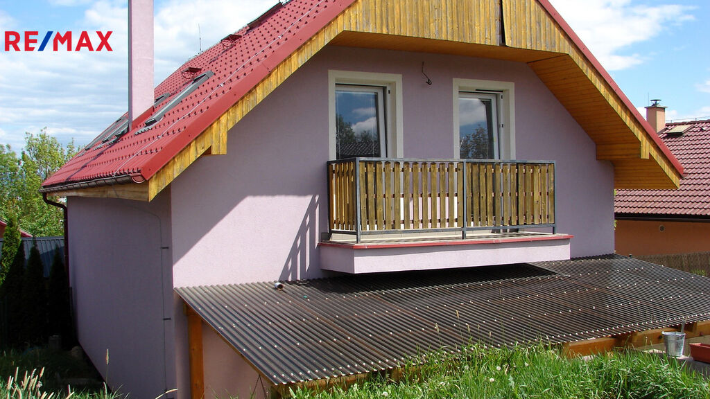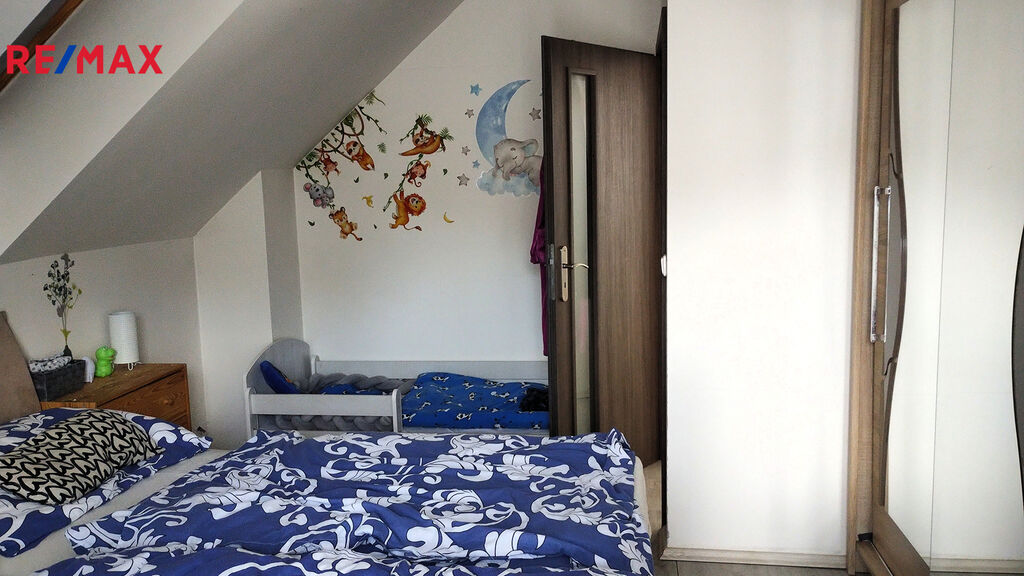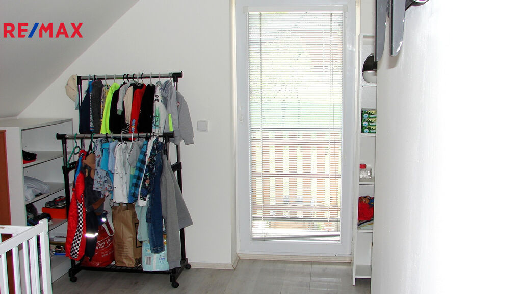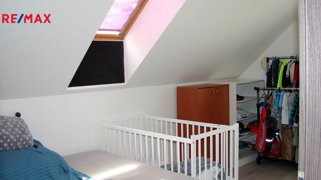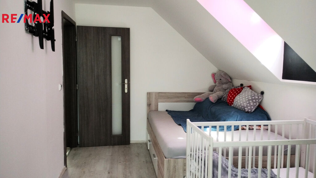 V patře se nachází ložnice se šatnou a balkónem, koupelna s rohovou vanou a další dva pokoje s výstupem na balkón a výhledem do zahrady.