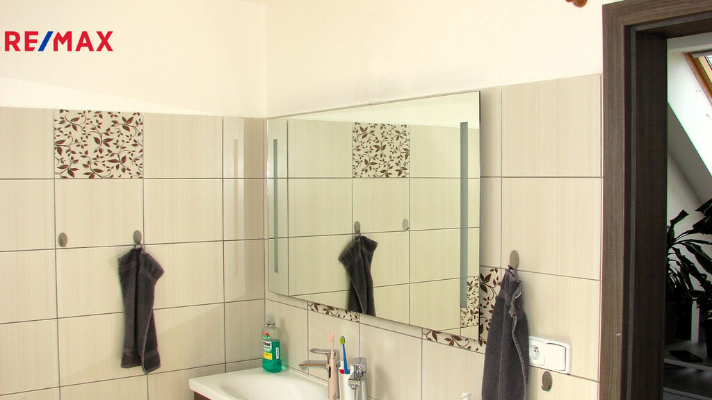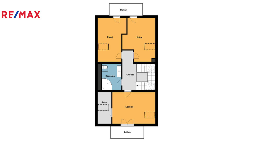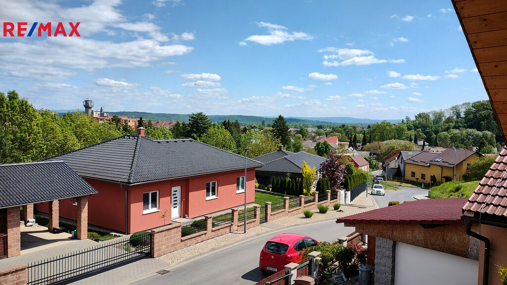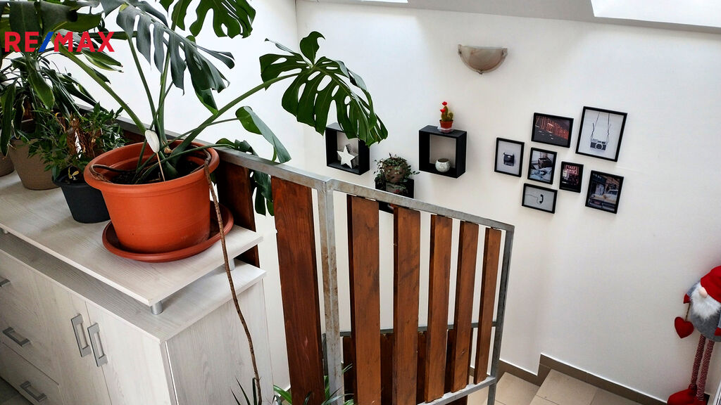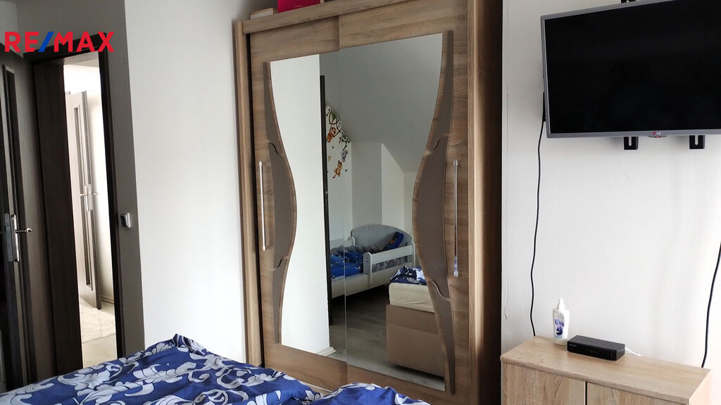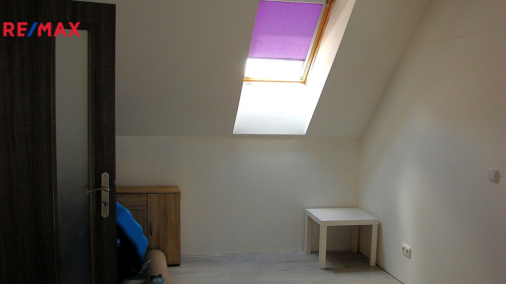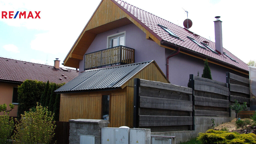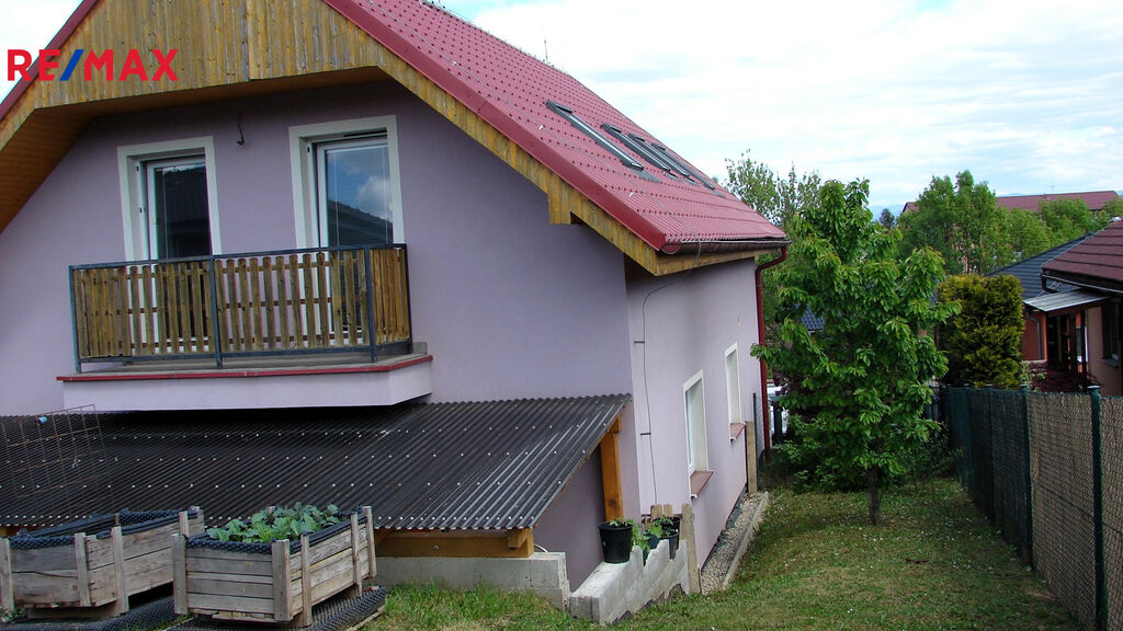 V patře se nachází ložnice se šatnou a balkónem, koupelna s rohovou vanou a další dva pokoje s výstupem na balkón a výhledem do zahrady.
