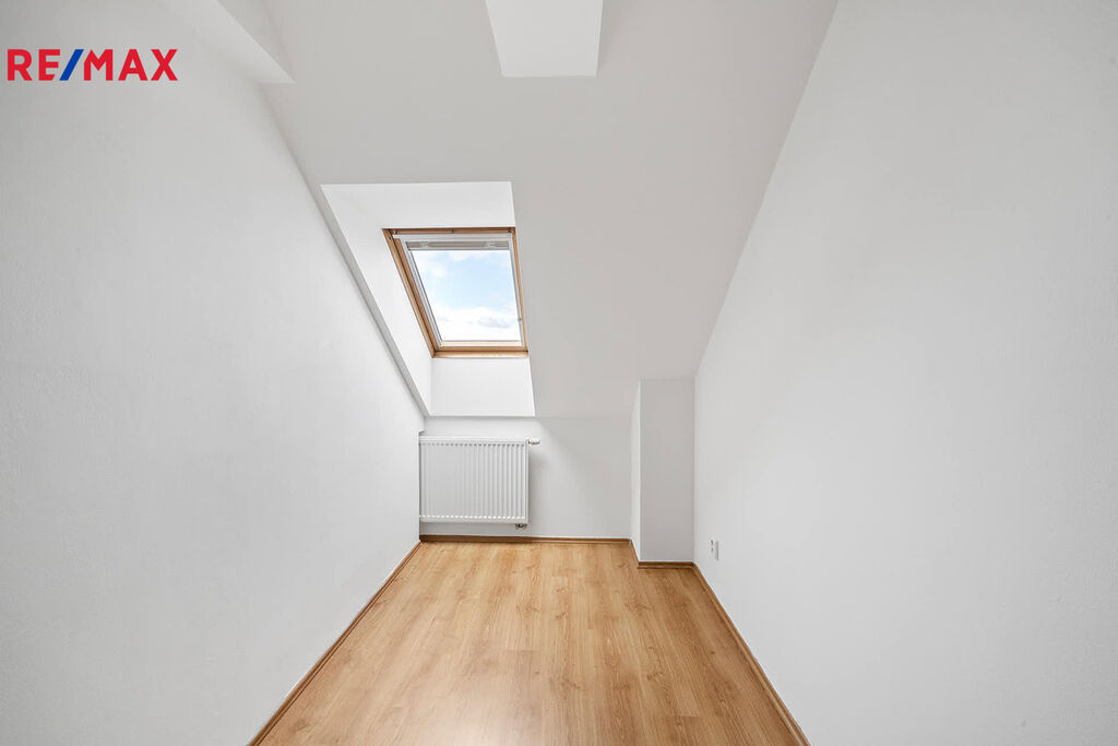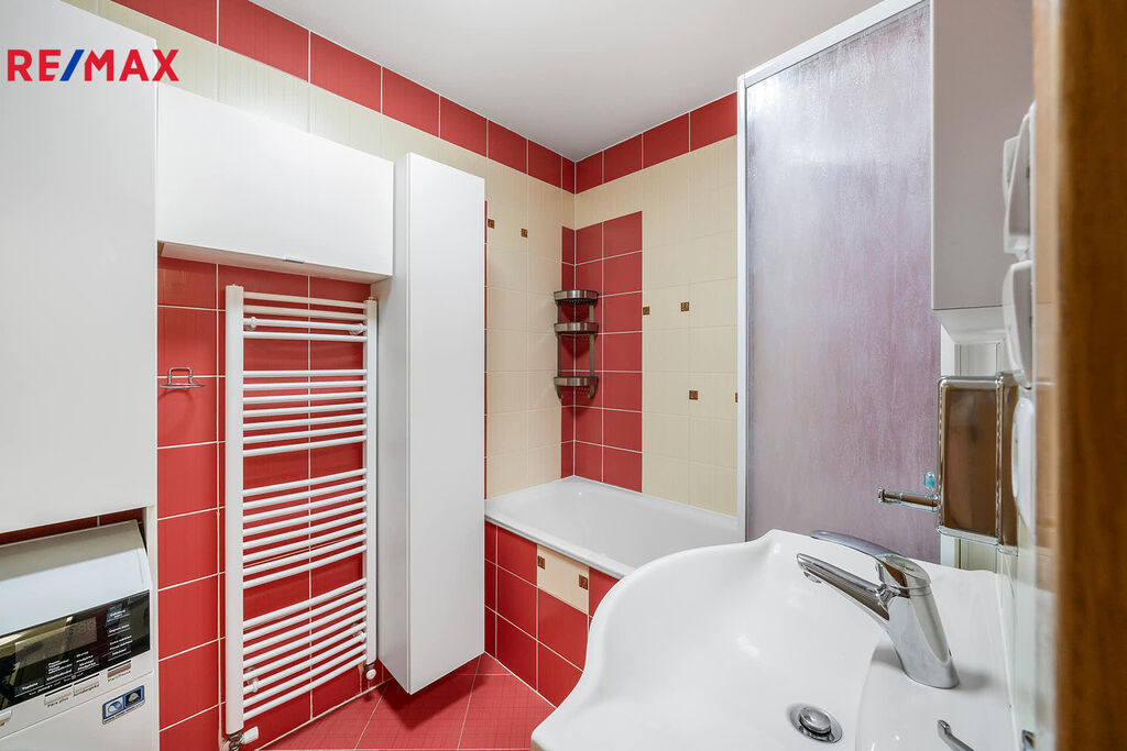 V chodbě se nachází šatní skříně vyrobené na míru a pod schody je praktický úložný prostor. Byt má samostatné WC, koupelnu s vanou a pračkou zn. AEG, která je spolu s varnou deskou stále záruce.