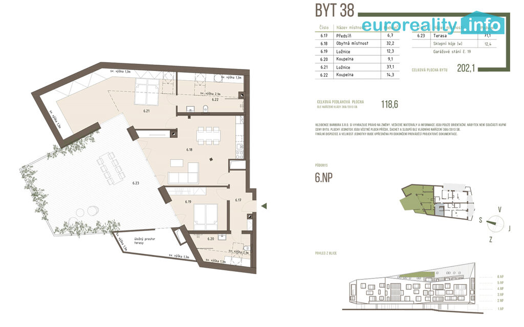 Celková užitná plocha bytu 118,6 m² a terasy 71,1 m² zajišťuje pohodlné a prostorné bydlení. Se sklepní kójí o rozměru 12,4 m² činí celková plocha bytu 202,1 m². Apartmán je koncipován tak, aby byl maximálně funkční a zároveň esteticky přitažlivý.