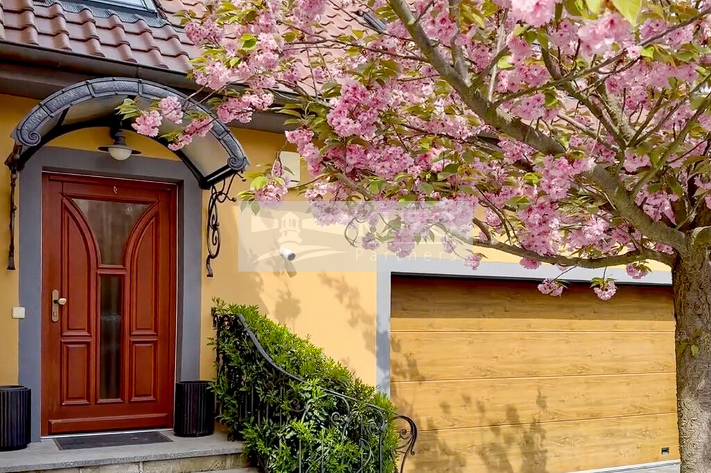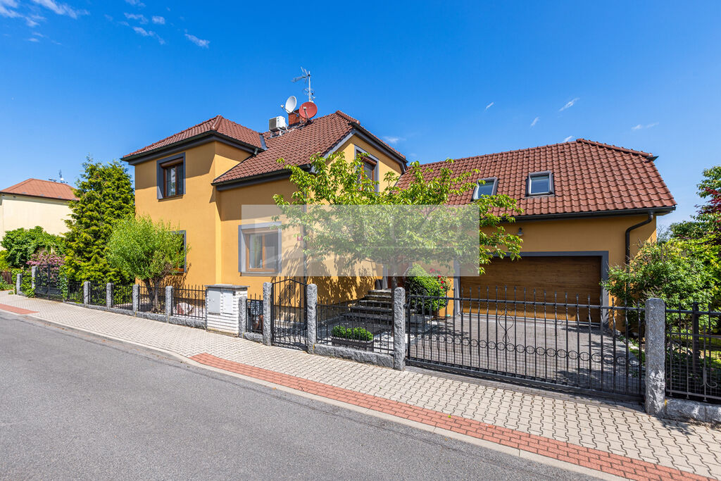 Již při příjezdu vás zaujme elegantní kovaný plot s masivními žulovými sloupky, který dodává celému domu reprezentativní charakter. Dálkově ovládaná vjezdová brána otevírá přístup k prostorné dvojgaráži, která zajišťuje komfortní parkování pro dvě auta a dostatek místa pro další vybavení.